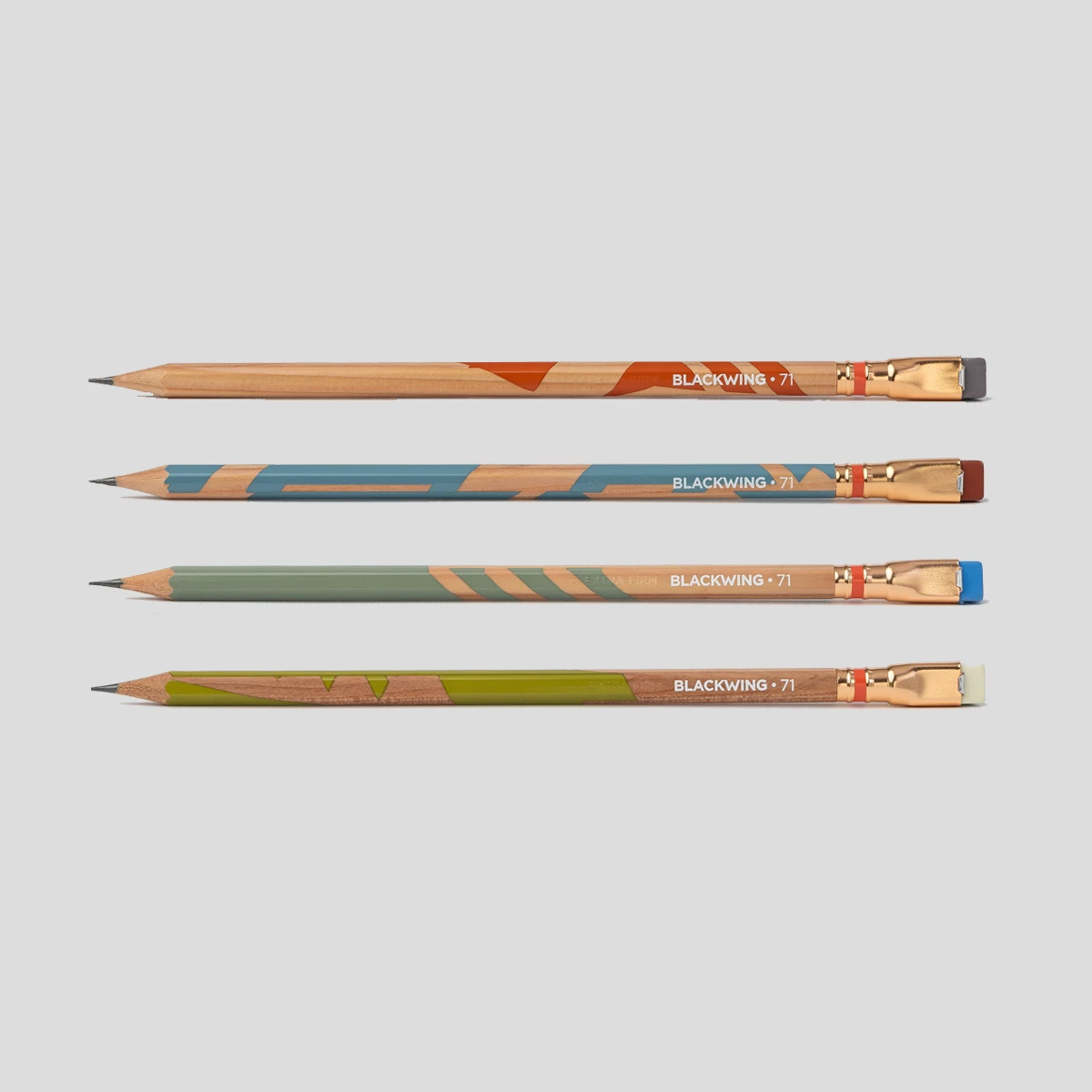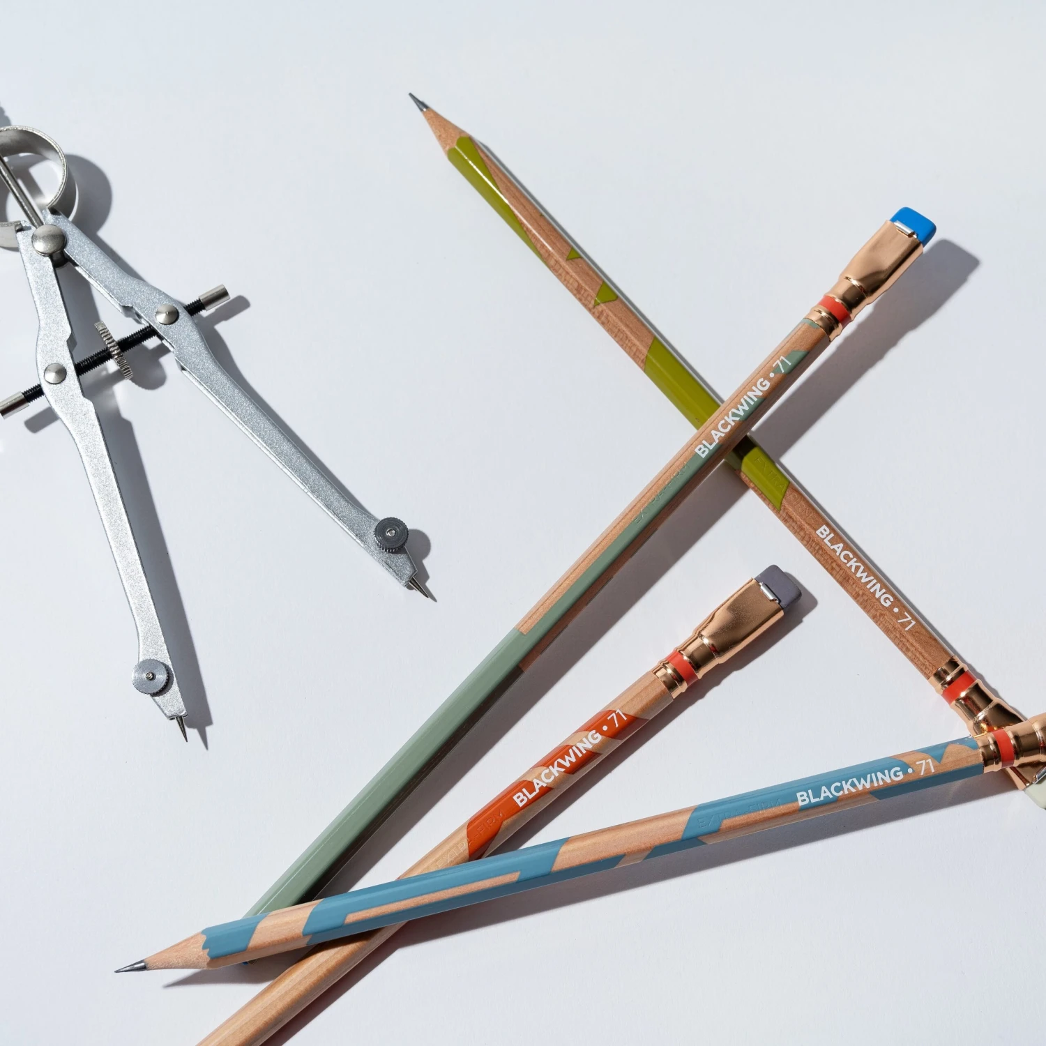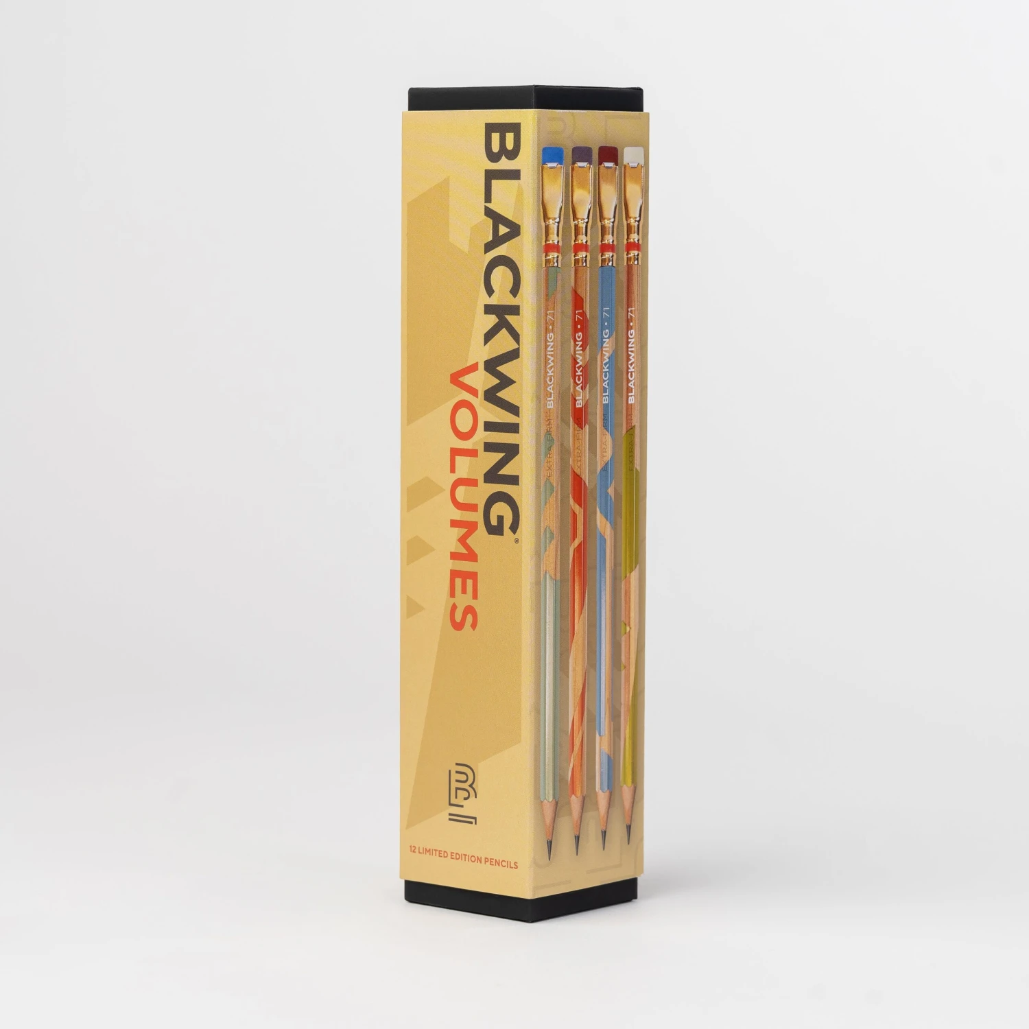 Blackwing Volume 71 è un omaggio a Frank Lloyd Wright e alla sua ambizione architettonica. Ogni matita presenta la sagoma di una delle sue iconiche assi perforate stampata in un colore tenue. L’area attorno all’asse è vuota, lasciando trasparire il legno naturale della matita. Ogni matita include anche una ghiera in rame e la grafite Blackwing Extra-Firm.