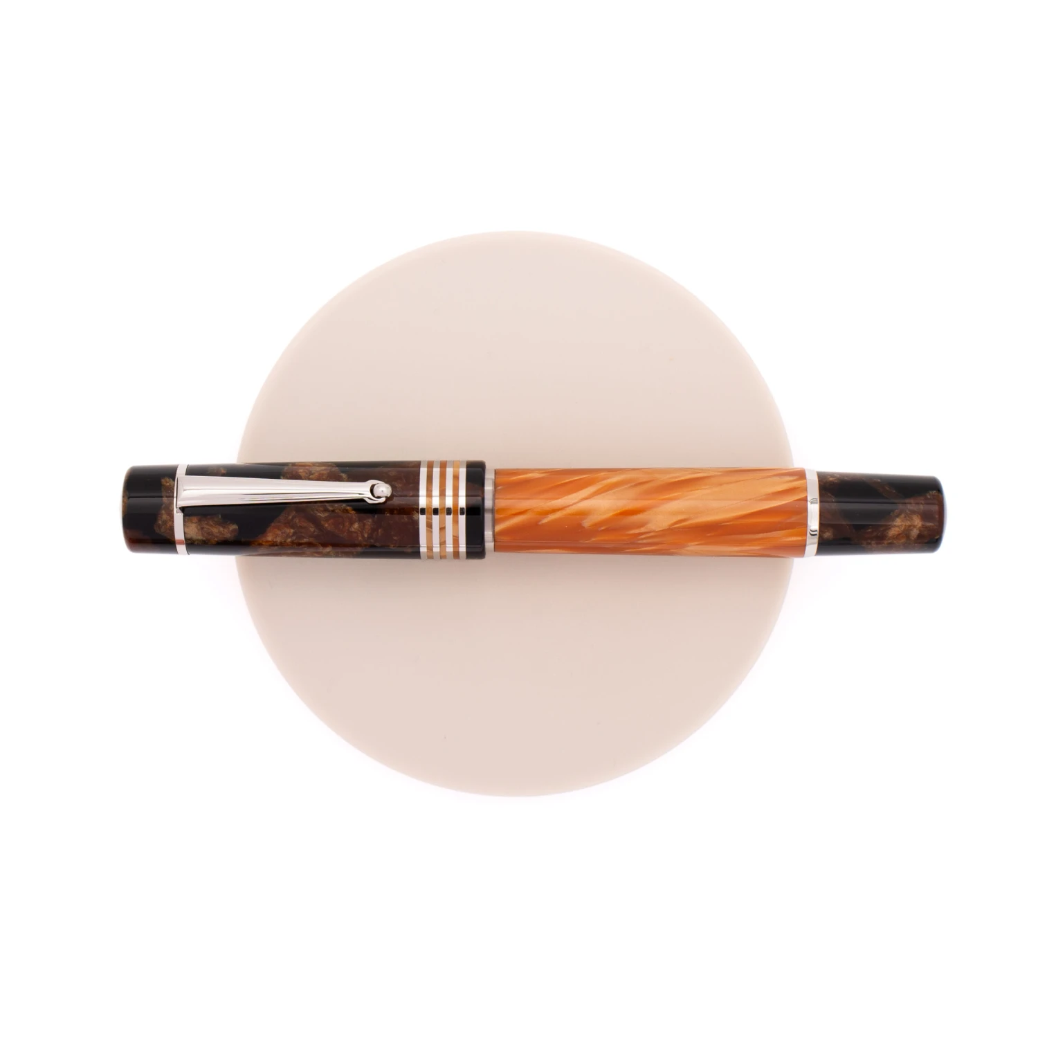 Le tonalità profonde e regali della celluloide utilizzata per la realizzazione di questa penna, evocano i simboli araldici e lo splendore della corte milanese, fondendo arte, storia e scrittura in un unico, raffinato oggetto.