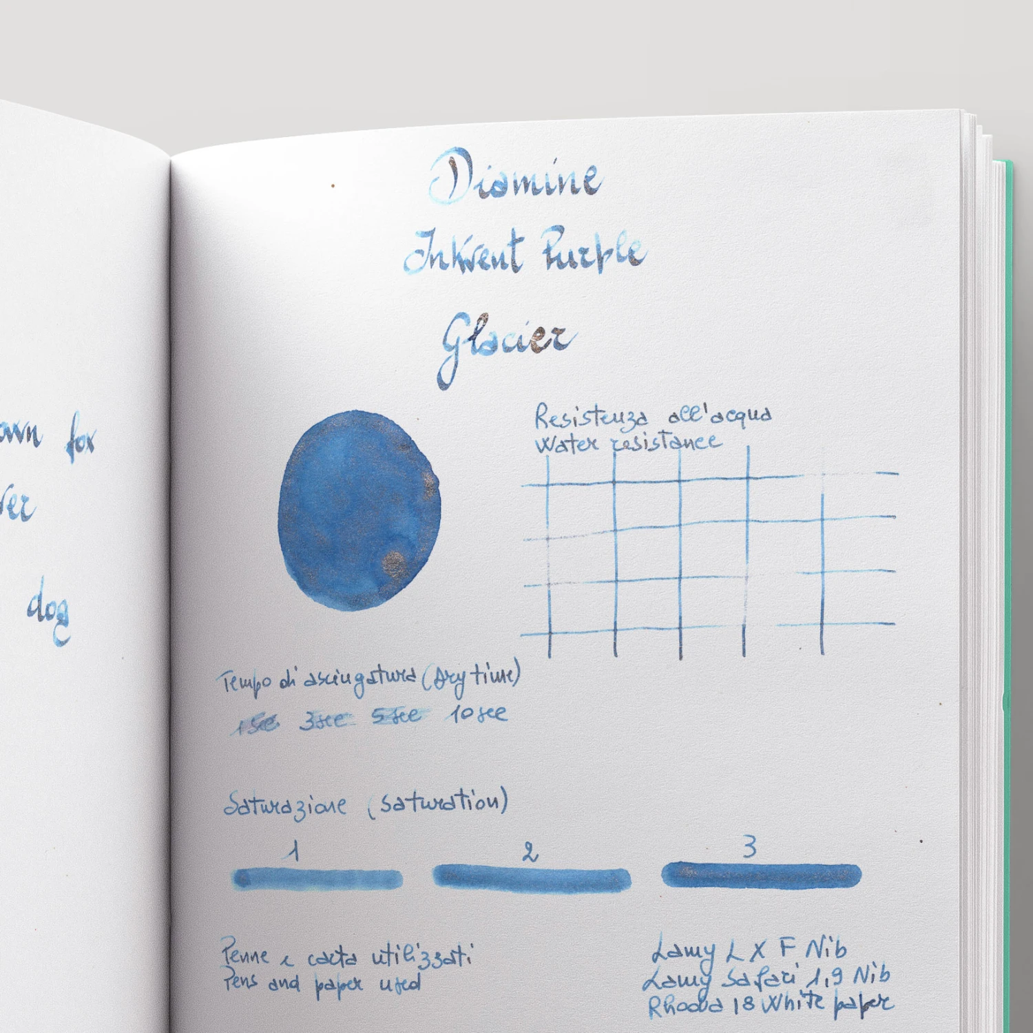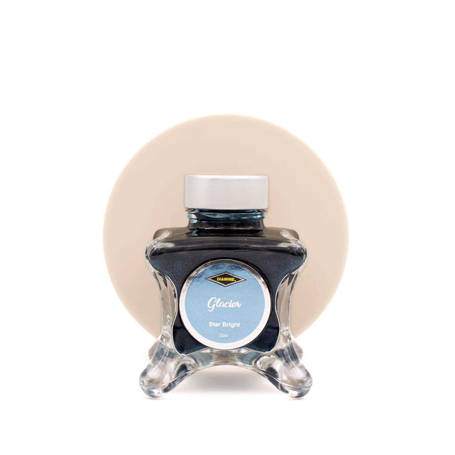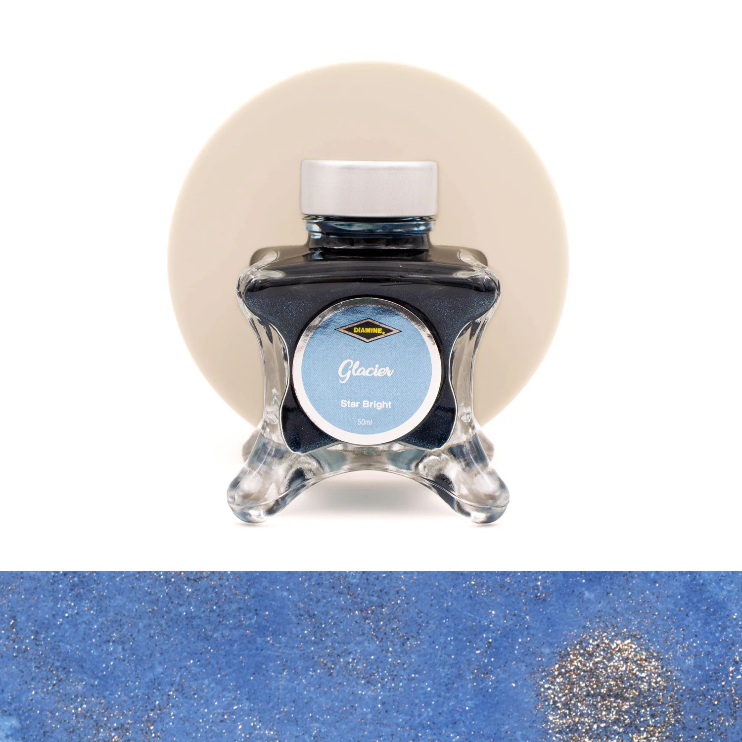Diamine Inkvent Glacier è un inchiostro per penne stilografiche di tipo star bright confezionato in una bottiglia di vetro da 50 ml. Starbright è un nuovo tipo di shimmer con proprietà scintillanti migliorate. Gli inchiostri per penne stilografiche Diamine Shimmer contengono delle sostanze solide all’interno del liquido. Consigliamo di agitare il flacone prima della ricarica ed essere diligente nella pulizia della penna stilografica quando si utilizzano questi inchiostri.
