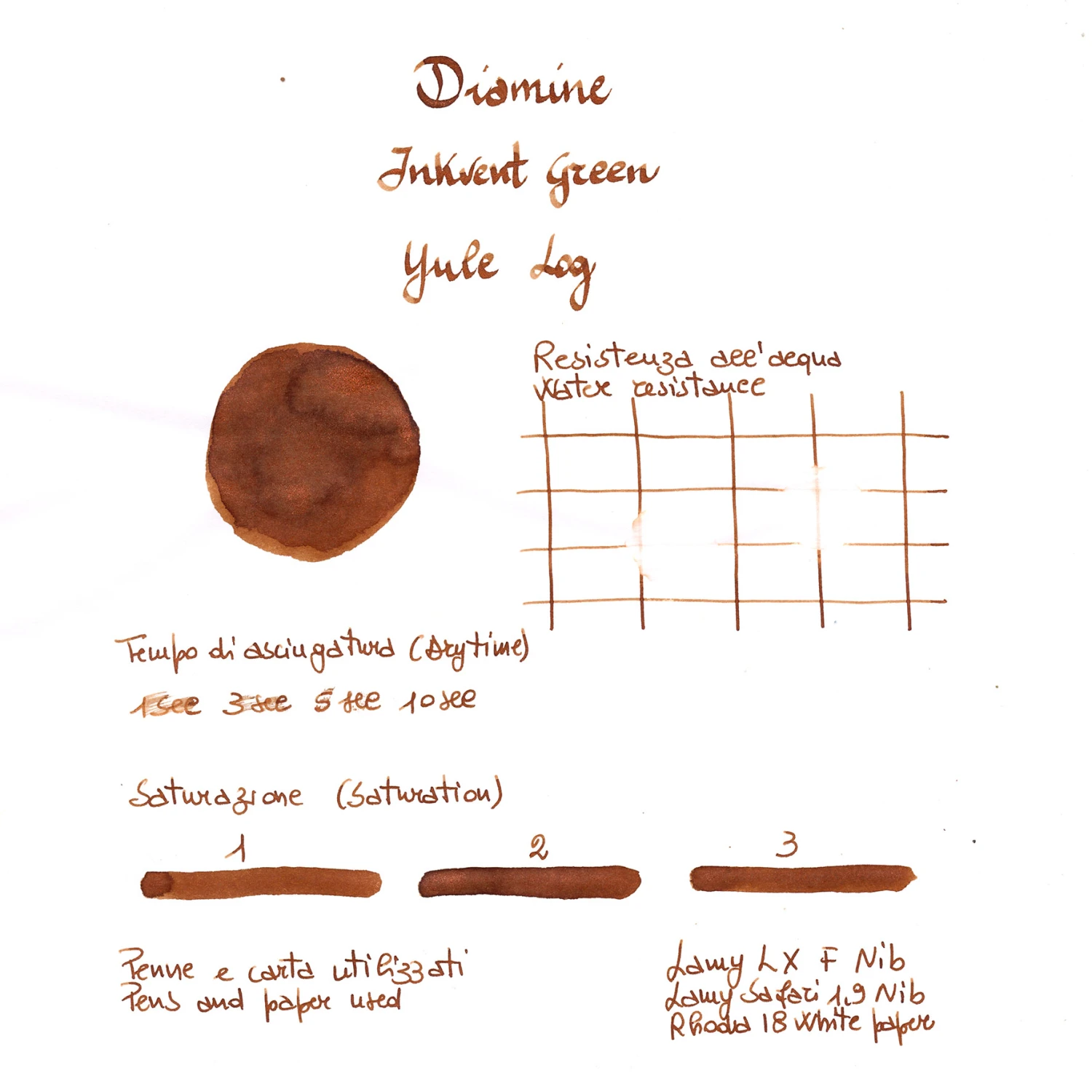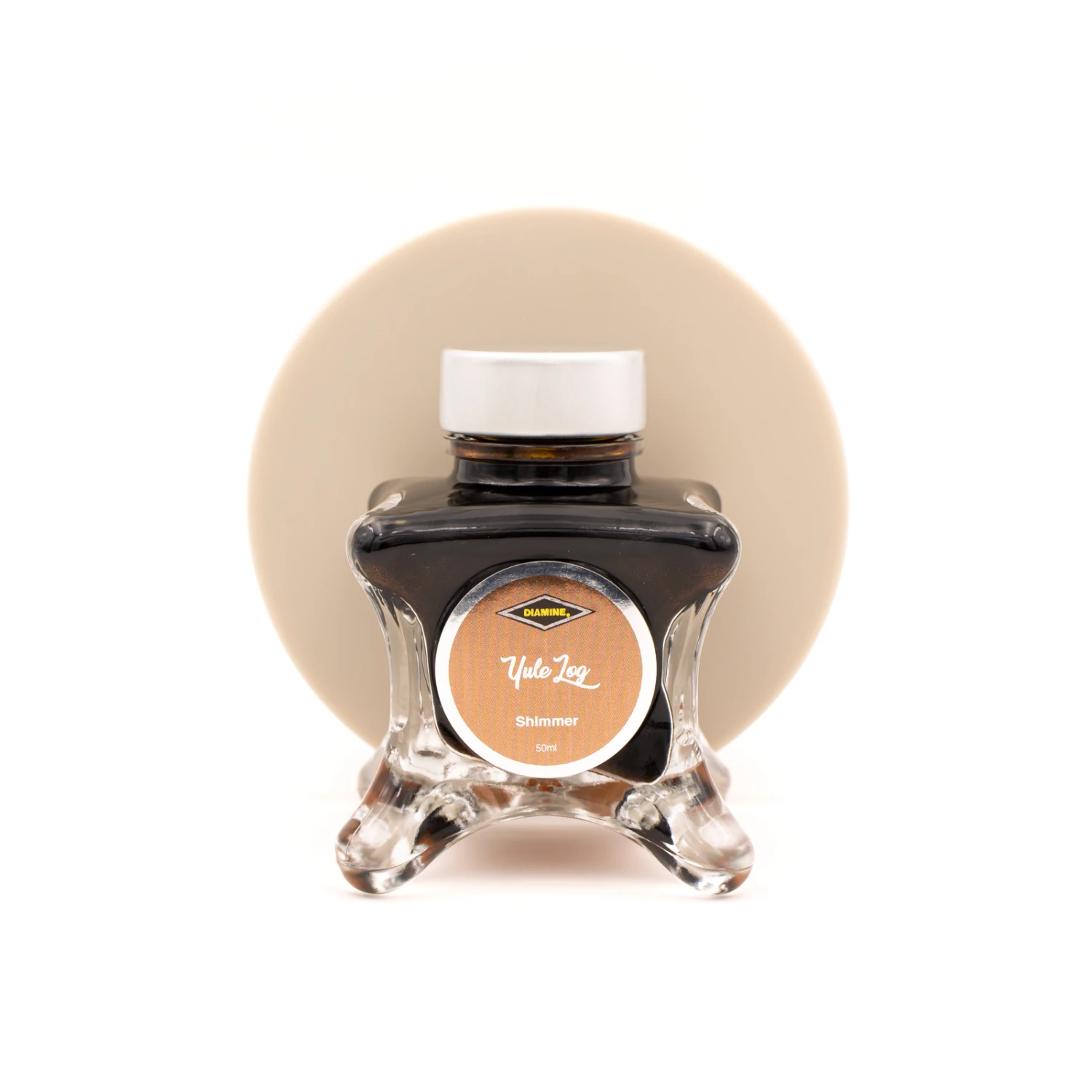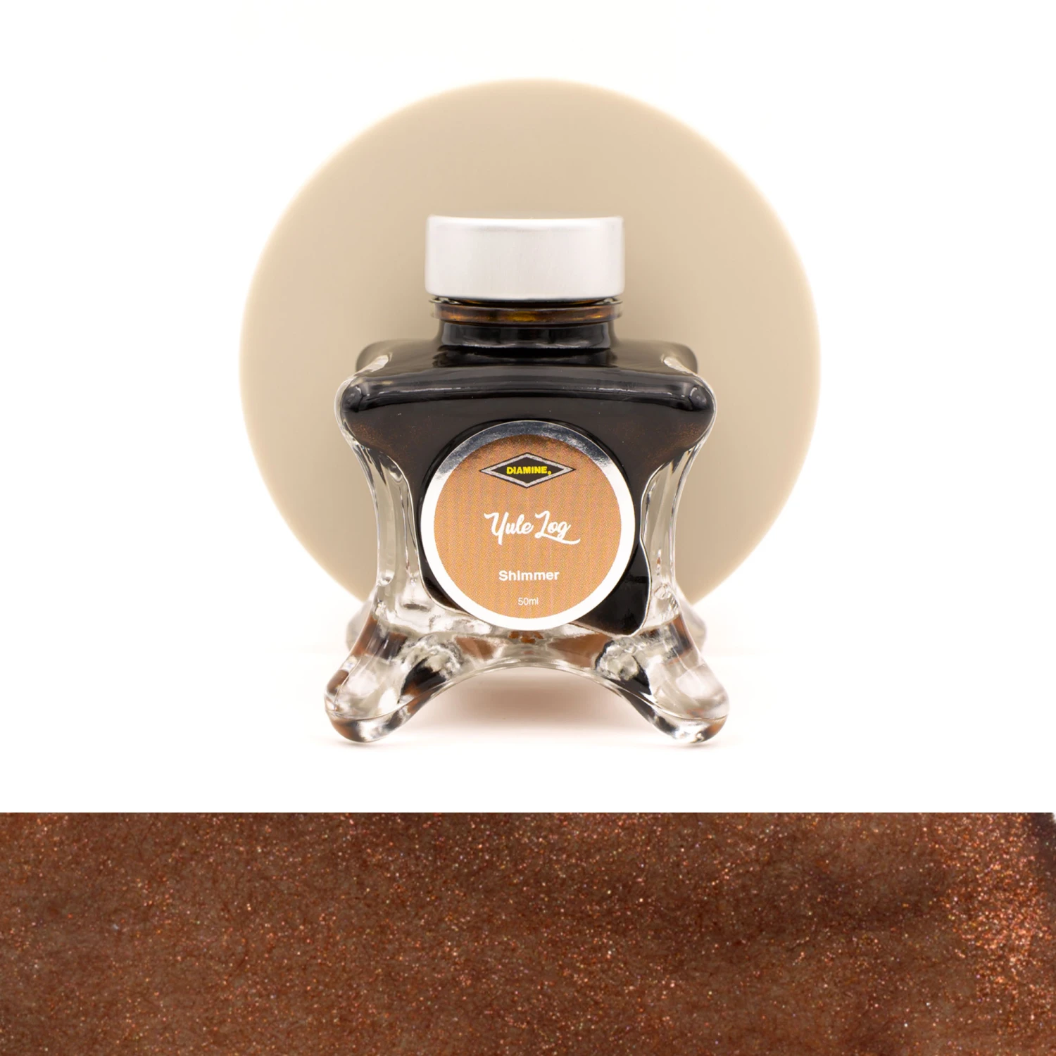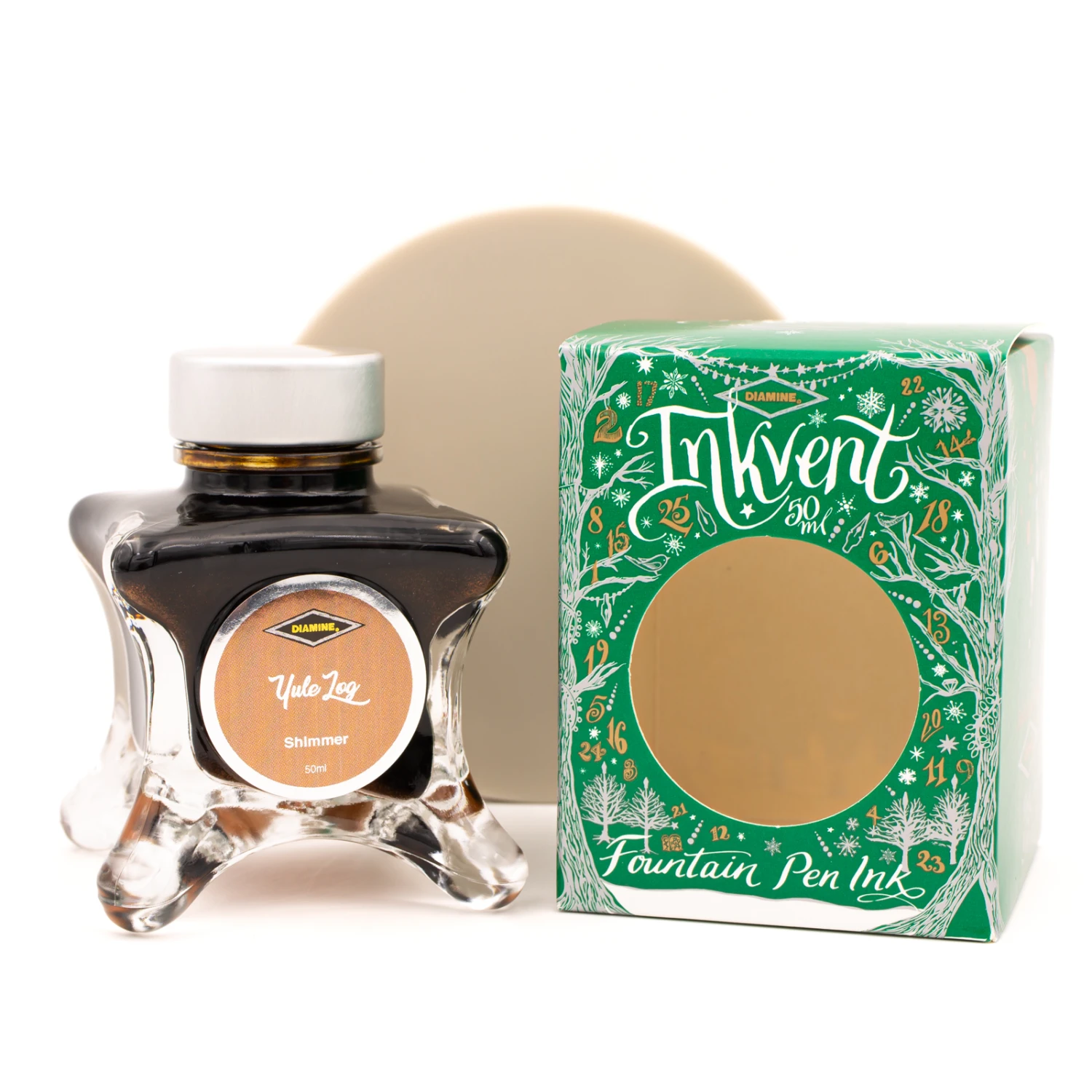 Diamine Inkvent Yule Log è un inchiostro per penne stilografiche shimmer confezionato in una bottiglia di vetro da 50 ml.
