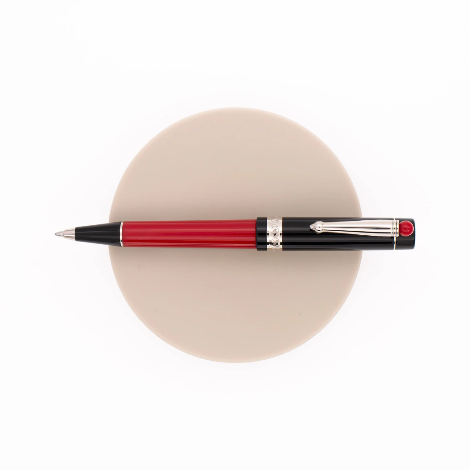 Dolcevita Emozione Rossa è una penna sfera ma anche un grazioso portafortuna. Realizzata in resina rossa tornita e lucidata a mano, contiene un corno in corallo all’interno della clip.