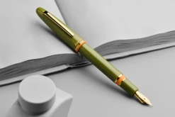 Esterbrook Estie Quirky Leaf è realizzata in resina acrilico verde con una fascia arancione su corpo e cappuccio. È equipaggiata di un pennino in acciaio JoWo #6 e si ricarica con cartucce/converter ad attacco standard.