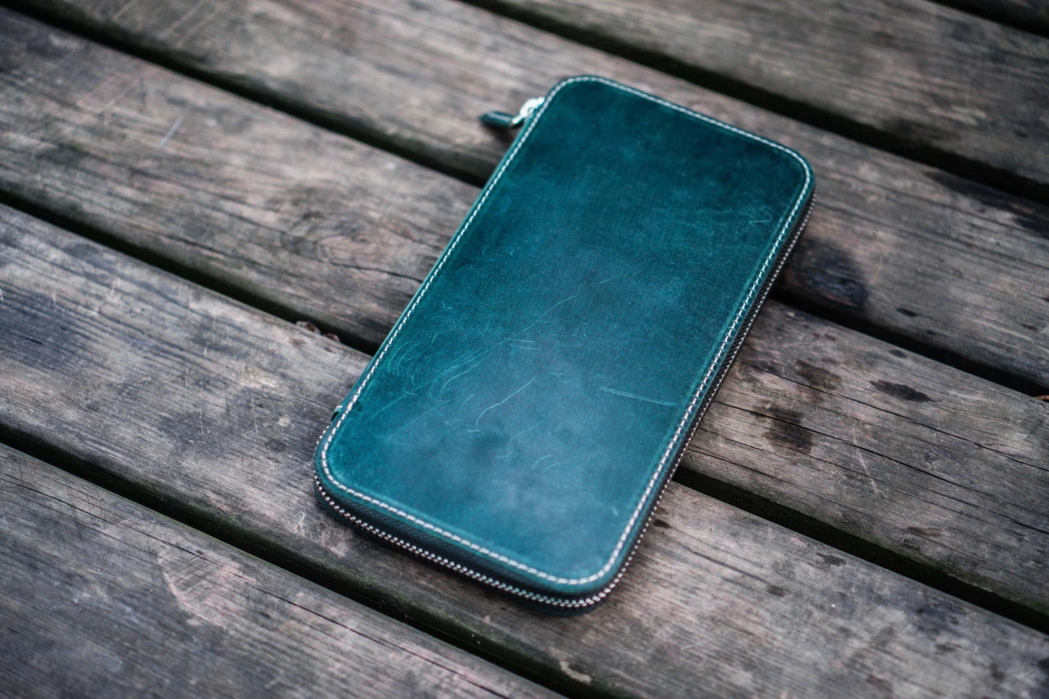 La pelle Crazy Horse Forest Green è caratterizzata da un colore verde scuro invecchiato che mostra parti con sfumature di verde chiaro e smeraldo. Questa tipologia di pelle invecchia e si ammorbidisce più rapidamente rispetto alla pelle tradizionale. Presenta una finitura scamosciata.