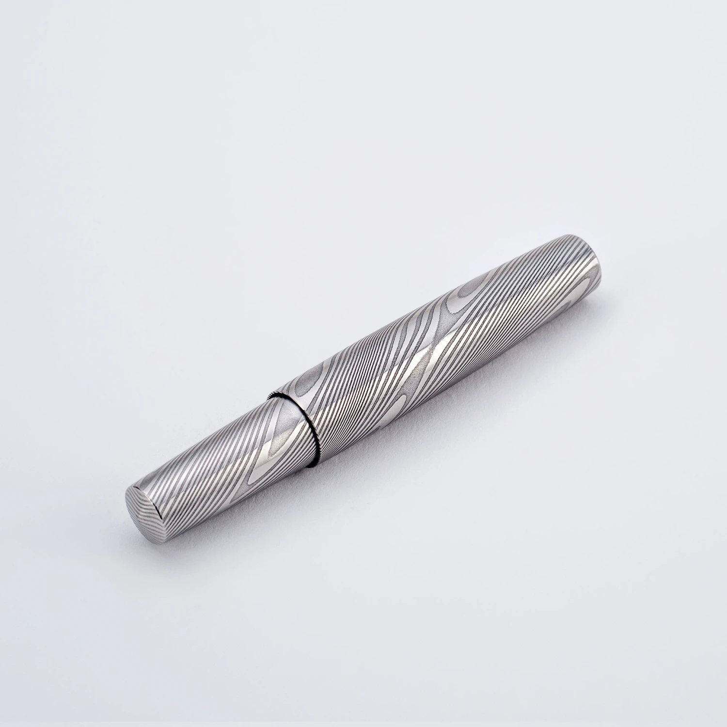L’acciaio Damasco è creato stratificando e legando varie leghe di acciaio. Questo processo si traduce in una superficie distintiva e strutturata che crea un effetto visivo sorprendente. Come materiale di prima qualità, l’acciaio di Damasco offre sia durevolezza che appeal estetico. L’interno del cappuccio è rivestito con un inserto in Delrin per evitare graffi durante l’inserimento. La sezione è realizzata in acciaio inossidabile.