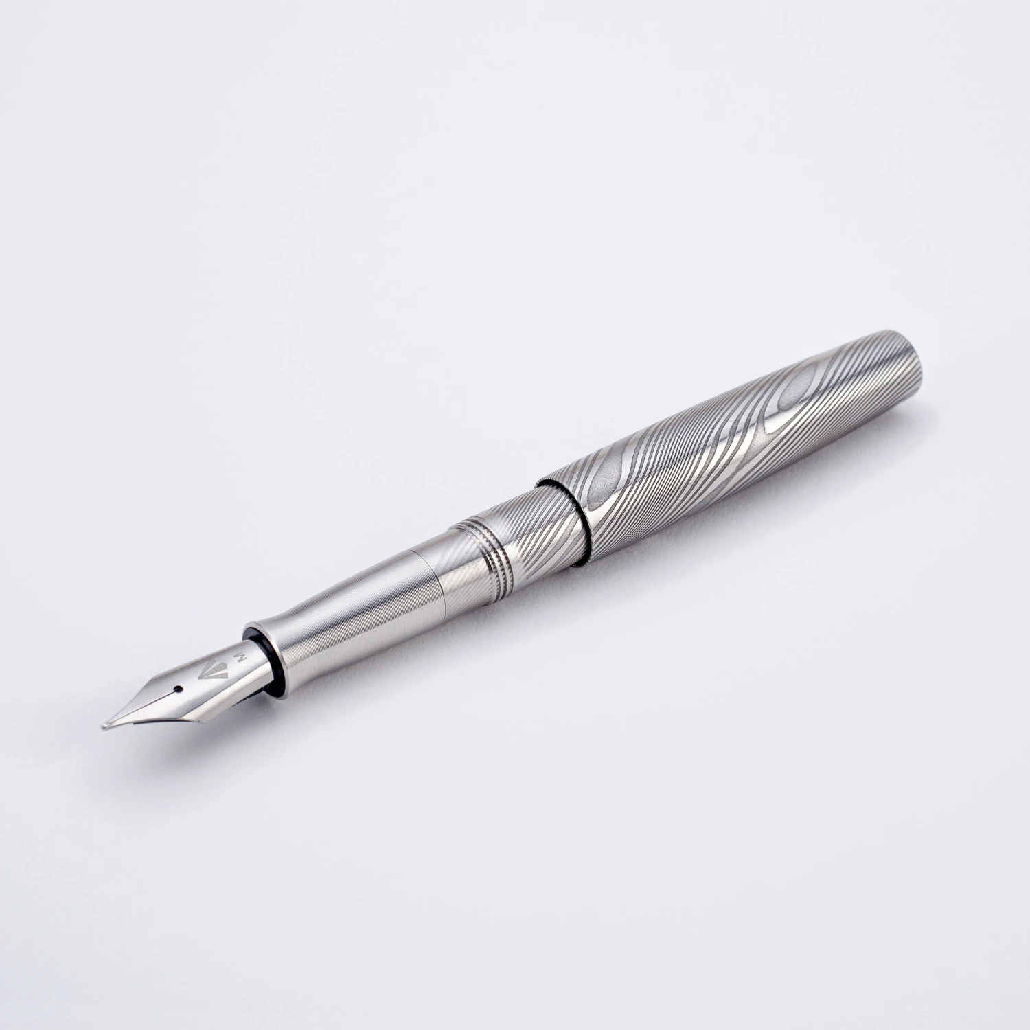 Gravitas Dinkey Damascus è equipaggiata di un pennino in acciaio progettato e prodotto da Gravitas e si ricarica con cartucce corte ad attacco standard. Vista la sua compatta dimensione, nessun converter è compatibile ma puoi inserire l’inchiostro con una pipetta direttamente nel corpo penna (eyedropper).