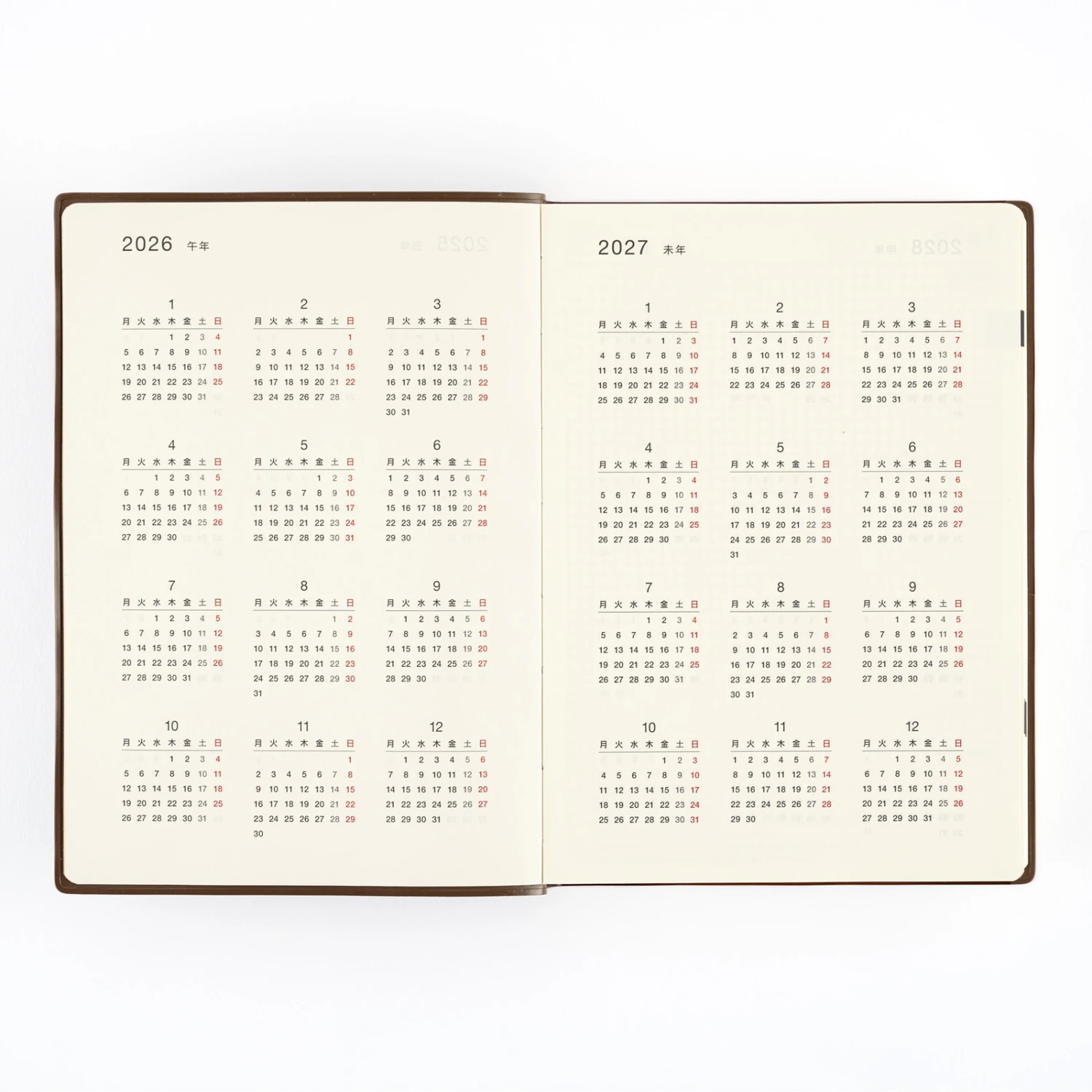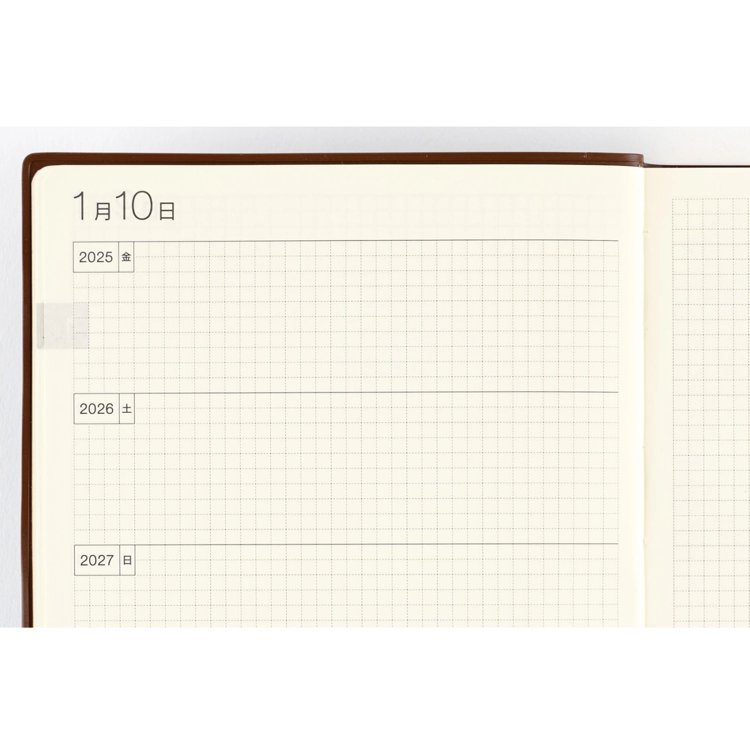 Hobonichi 5 Anni Techo in formato A5 ha pagine datate nell’arco di 5 anni. La copertina presenta una rilassante tonalità di marrone con gli anni impressi in oro e contiene un segnalibro marrone scuro per essere utilizzata anche senza aggiunta di una cover aggiuntiva. Ogni pagina contiene la stessa carta a quadretti da 3.7 mm utilizzata per le altre agende, rendendo la 5 anni perfetta per scrivere o disegnare.