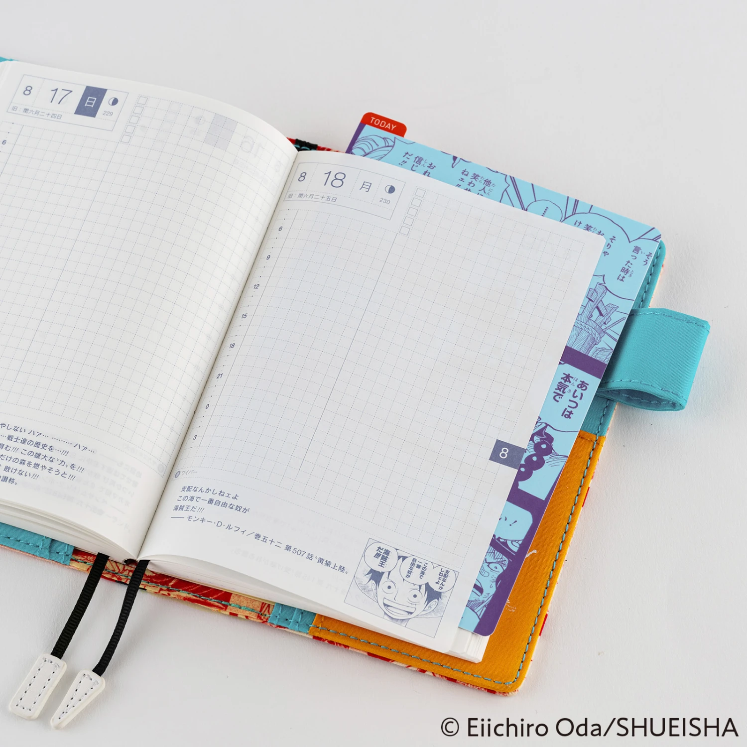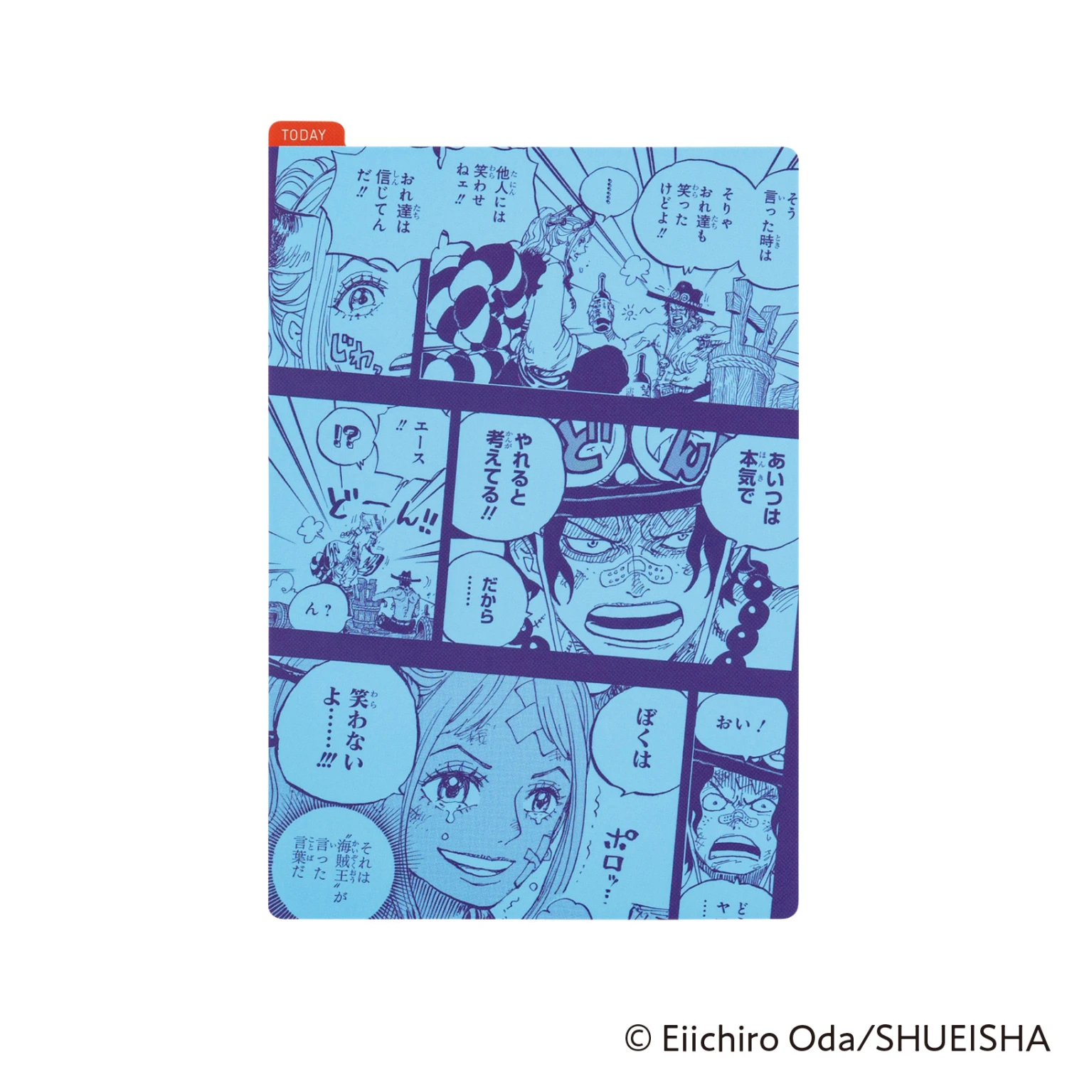 Il sottopagina One Piece per le agende Hobonichi Original A6 ritrae una conversazione tra Yamato e Ace, dal volume 99 dei fumetti. Le scene dei personaggi di One Piece coloreranno la tua quotidianità. Il retro del pencil board ha un fumetto in basso a sinistra.