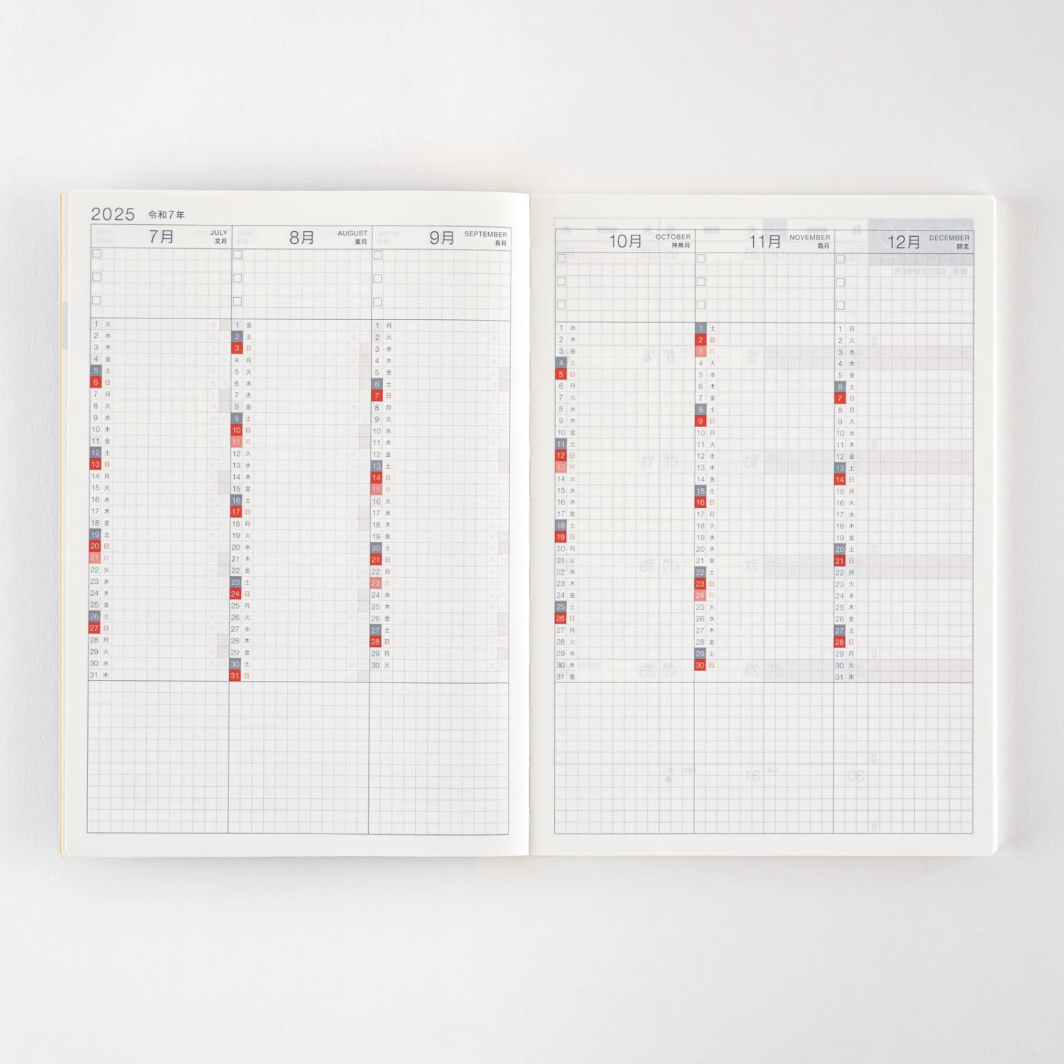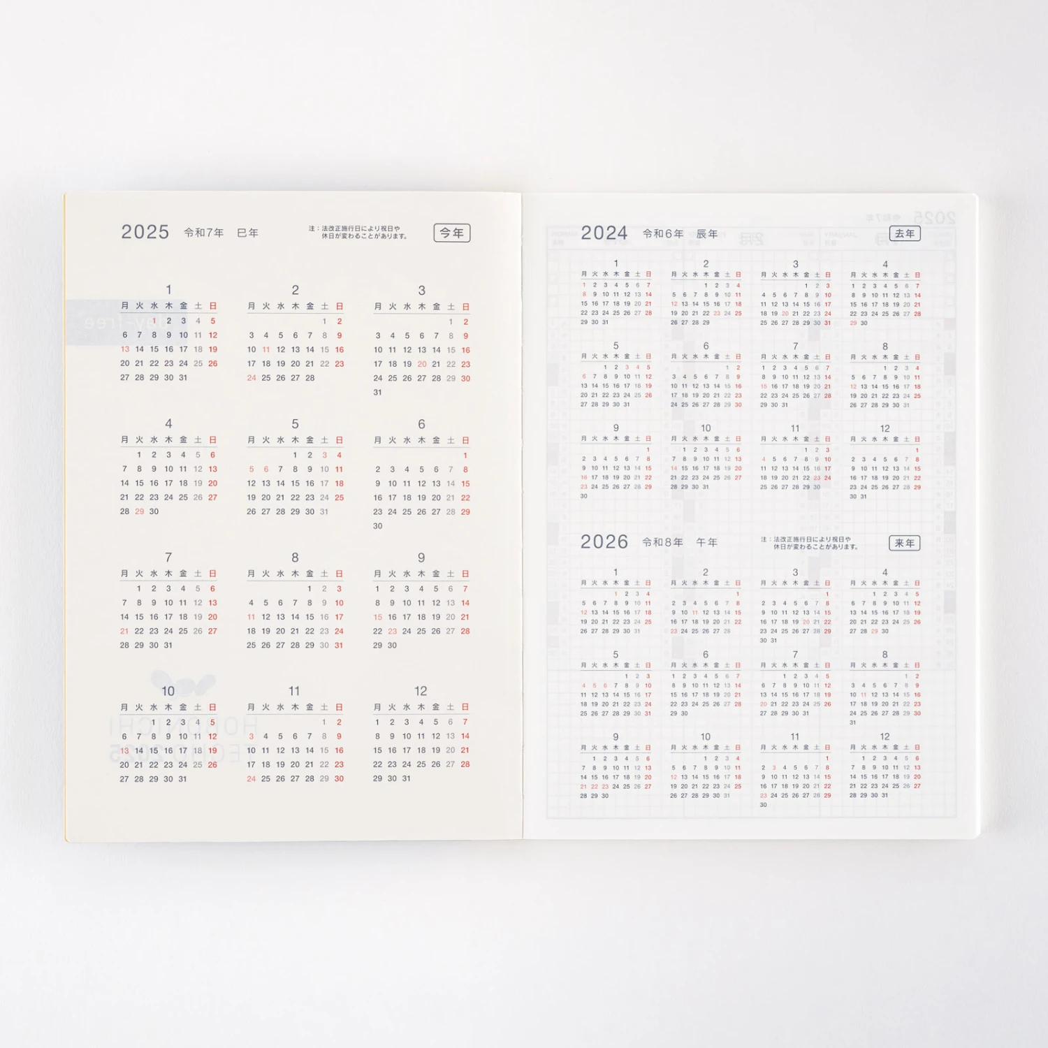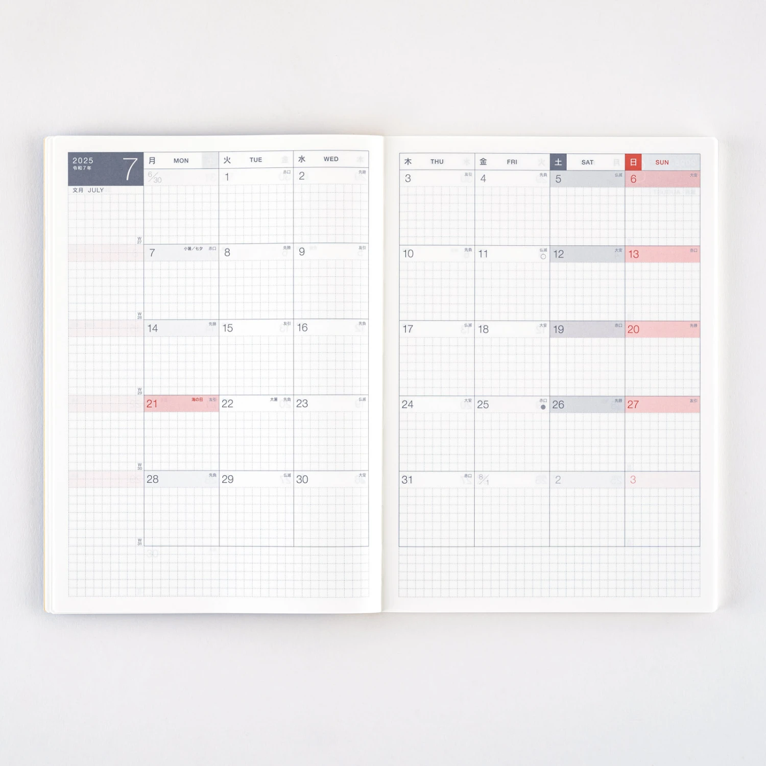 Hobonichi Techo Day-Free A5 è un’agenda mensile divisa in due parti principali: calendari mensili e carta a quadretti. Il libro si adatta perfettamente alle cover progettate per le Hobonichi formato A5. Poiché è circa la metà del libro Cousin per l’intero anno, è anche leggero e portatile.