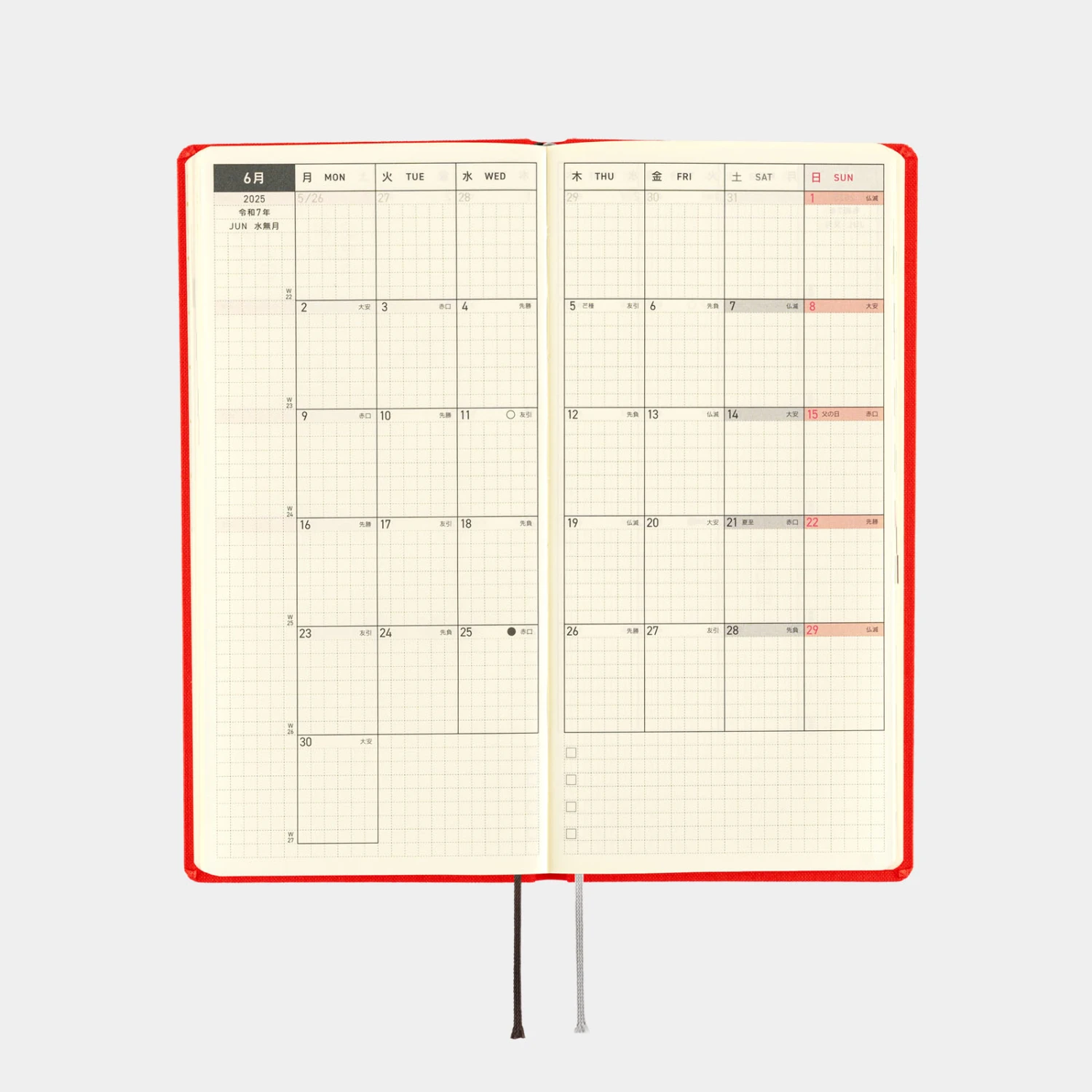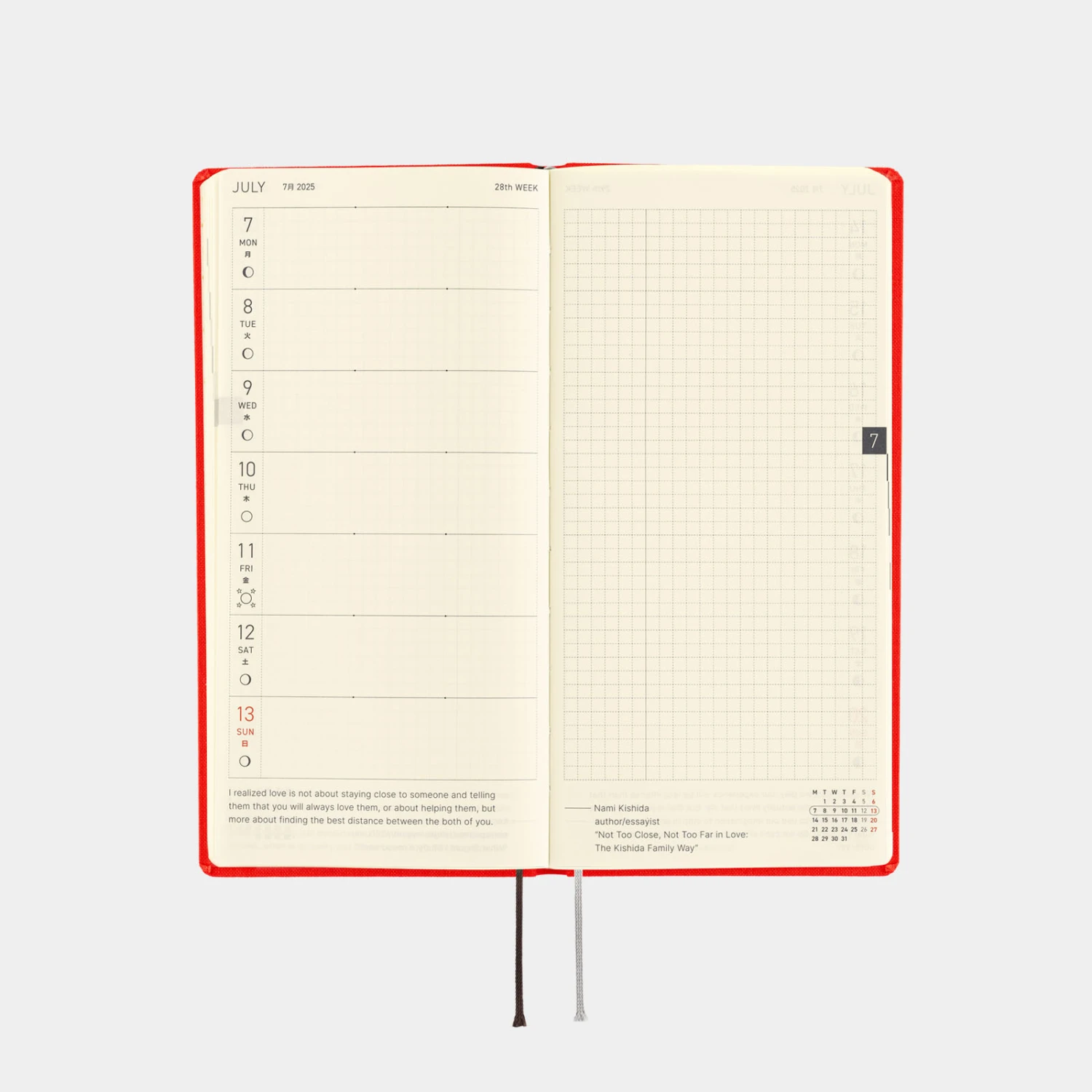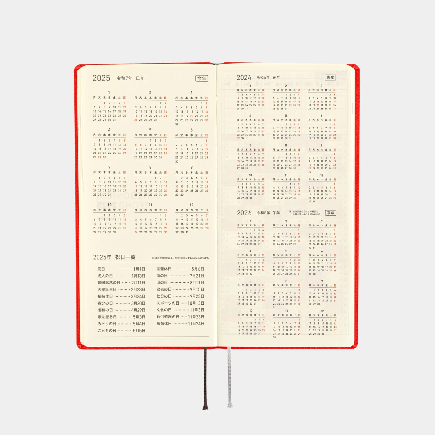 La serie Colors di Hobonichi Weeks offre agli utenti schemi di colori semplici ma unici, con una solida rilegatura e un tessuto della copertina piacevole al tatto. Chili Pepper è un’agenda in rosso acceso. Anche la lamina dell’anno 2025 stampata sulla copertina è di un colore rosso simile, combinando così diverse tonalità di rosso. I colori che ricordano un peperoncino che apre gli occhi ti terranno molto motivato.