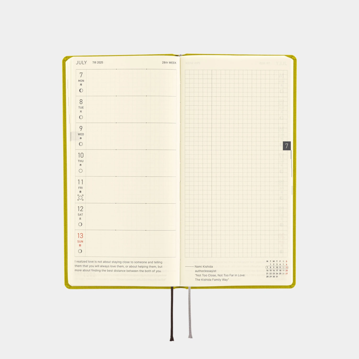 L’agenda settimanale ha spazio per scrivere piani o annotazioni di diario ed ha anche 69 pagine di promemoria con carta a quadretti (73 pagine nell’edizione inglese). Nella parte finale del libro ci sono pagine bonus, tra cui Sample Symbols and Icons e Oodles of Noodles. L’agenda Hobonichi Techo Weeks è disponibile in inglese o giapponese. Se ti piace questa cover, puoi scegliere la lingua che preferisci.