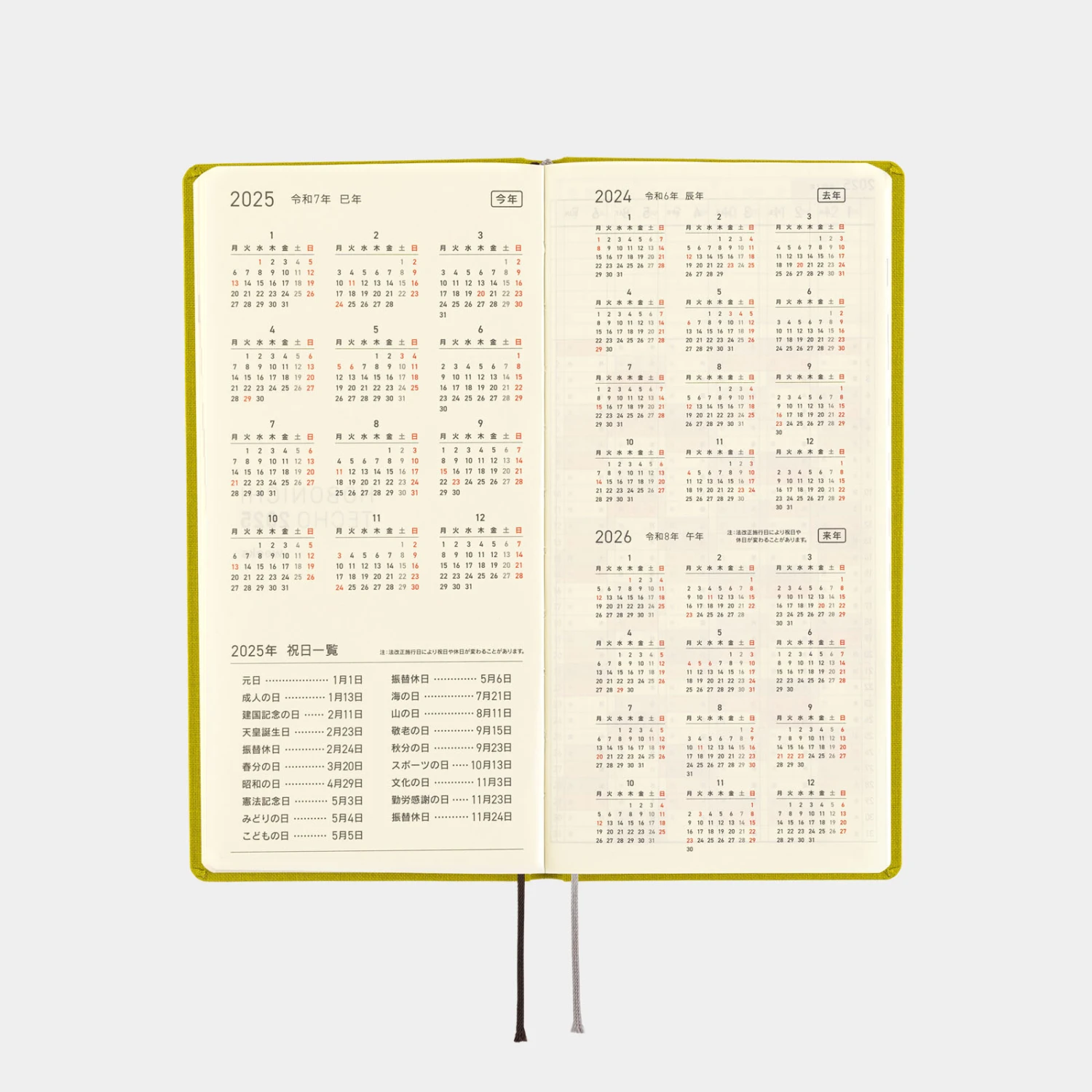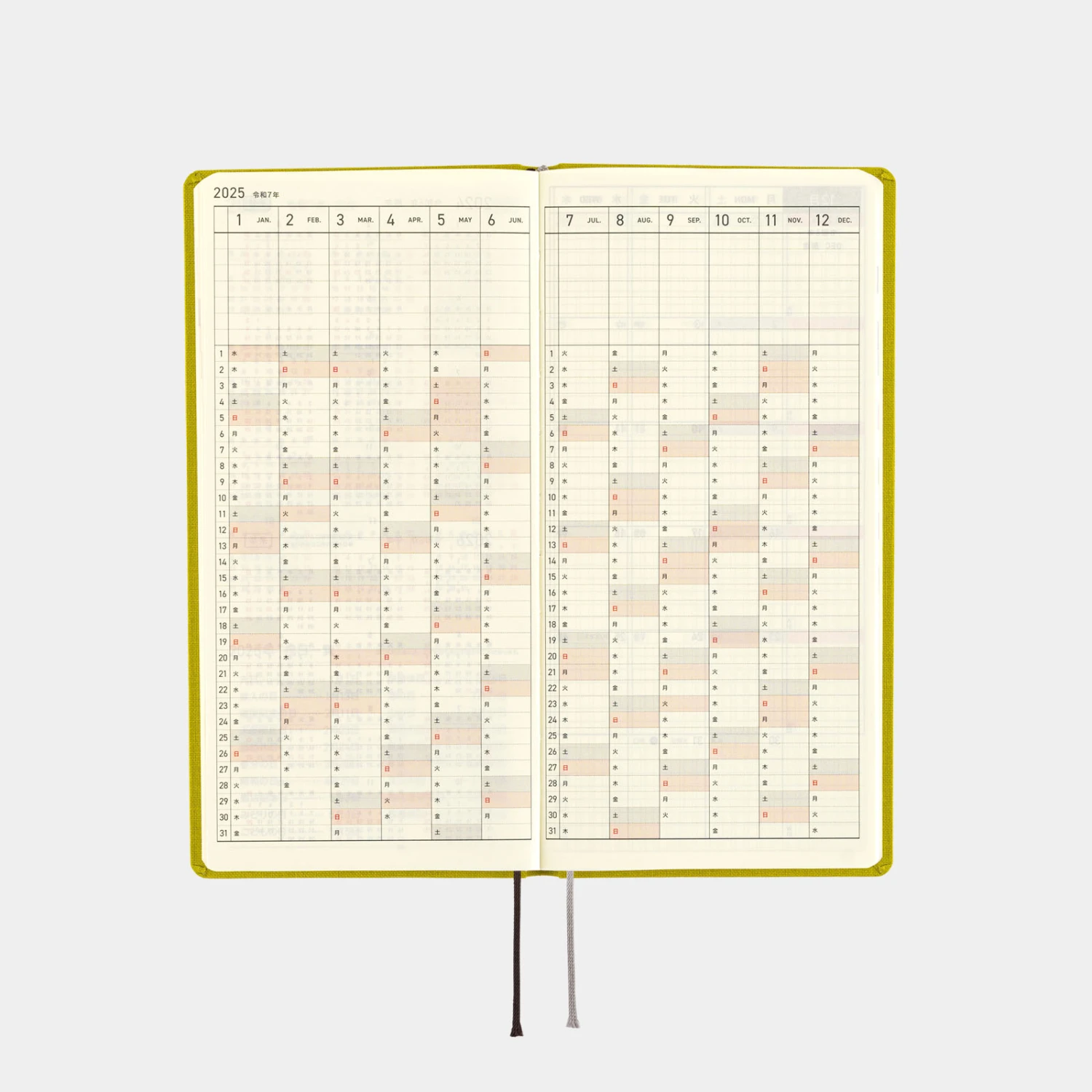 La serie Colors di Hobonichi Weeks offre agli utenti schemi di colori semplici ma unici, con una solida rilegatura e un tessuto della copertina piacevole al tatto. Pistachio presenta un fresco colore verde chiaro. L’anno 2025 sulla copertina è stampato in oro e brilla alla luce. Il verde pistacchio vibrante è perfetto per affrontare nuove sfide.