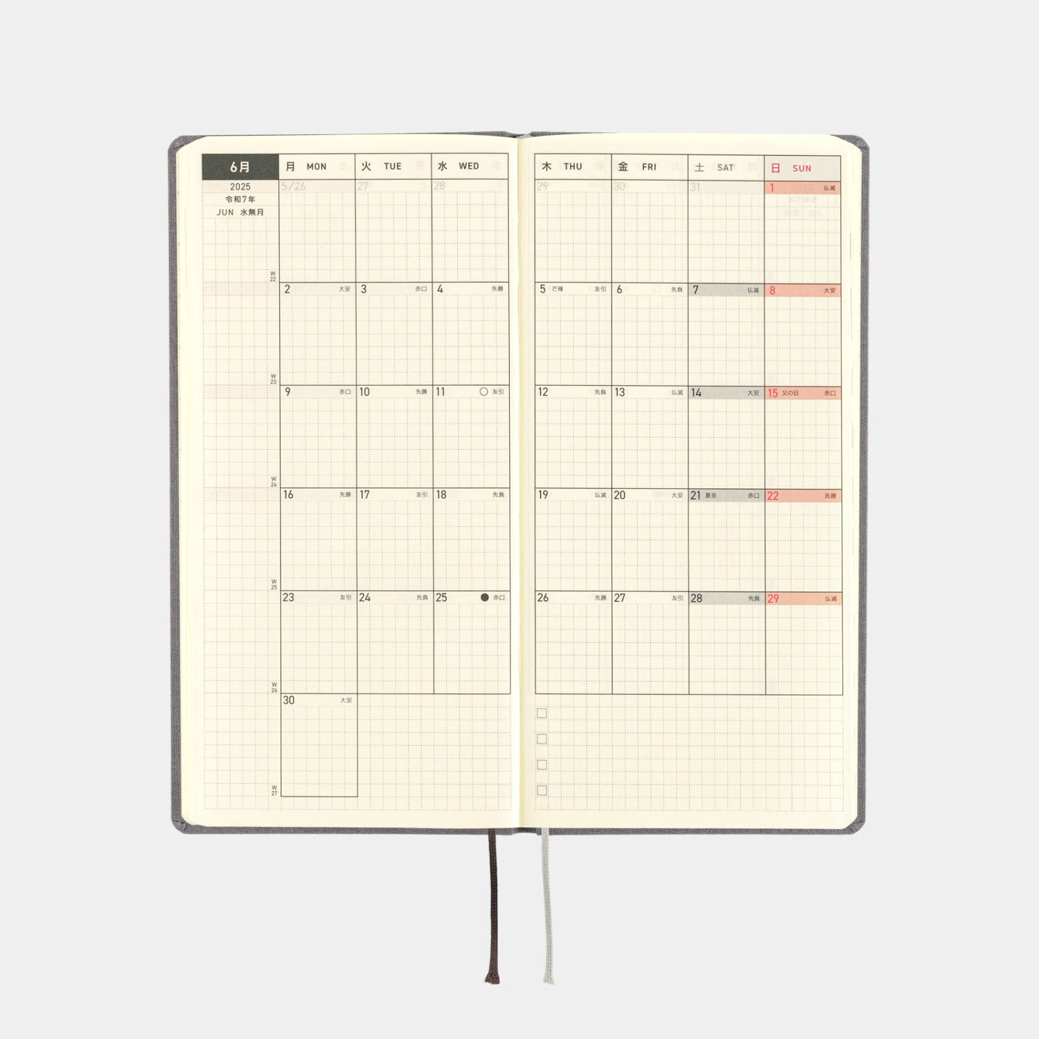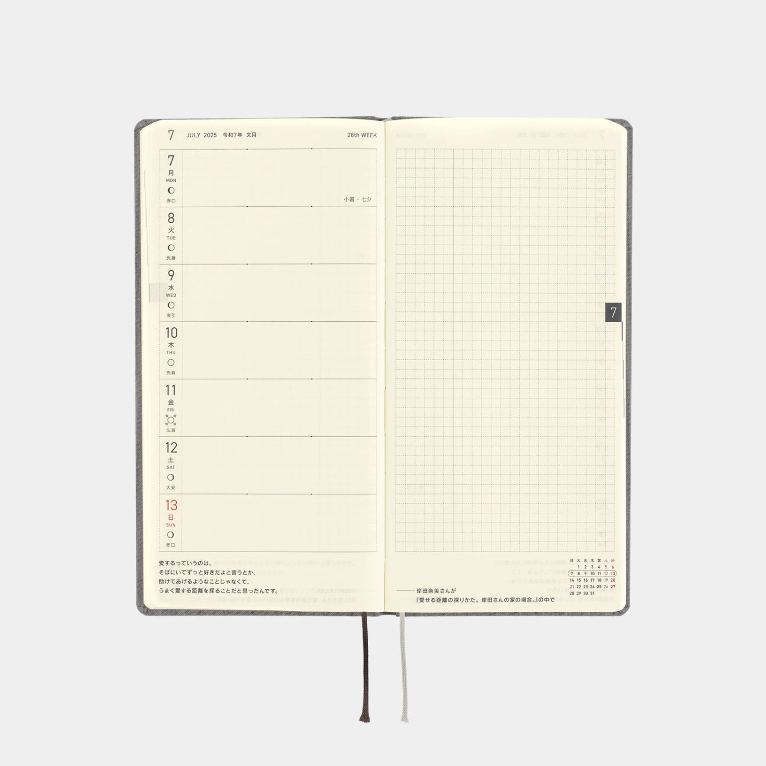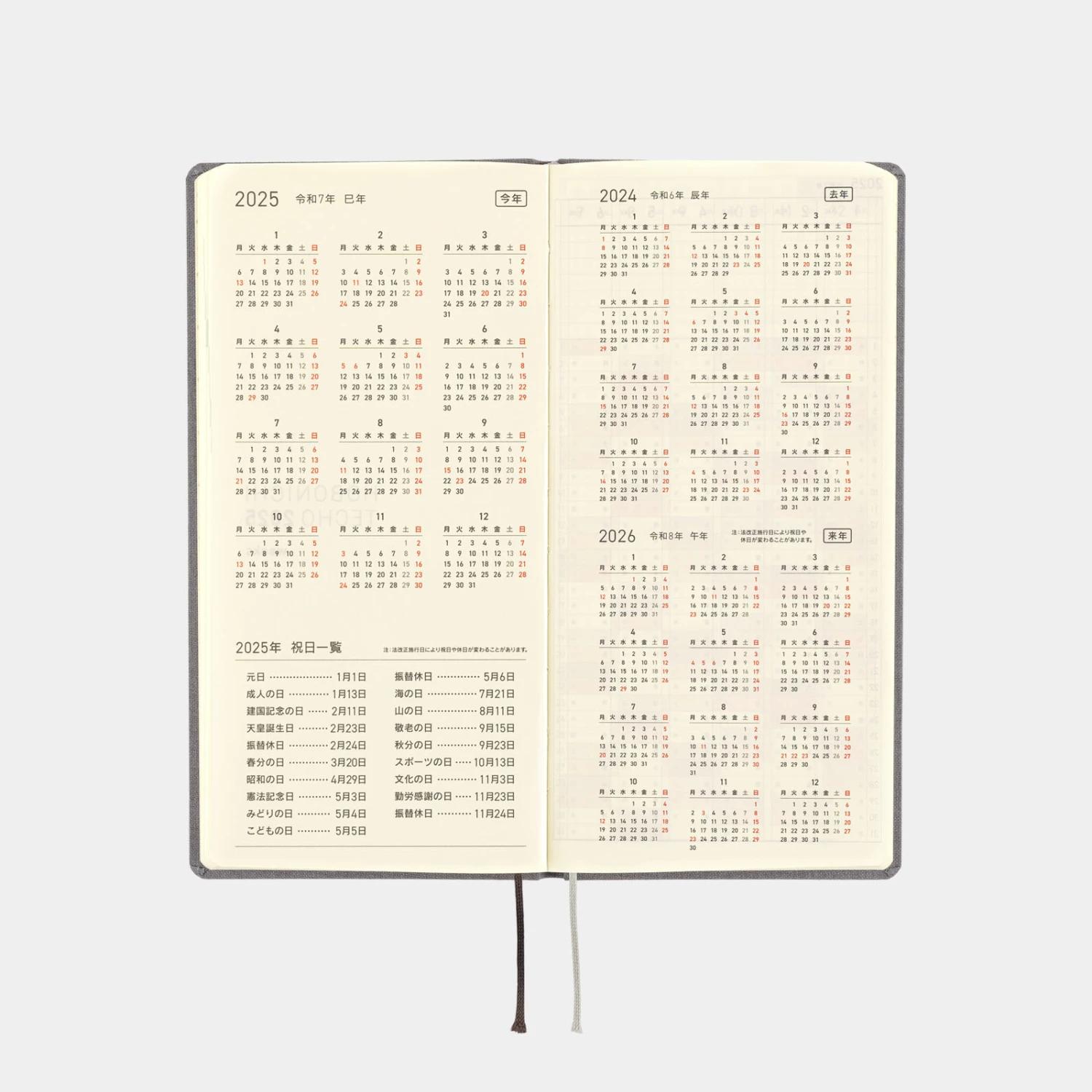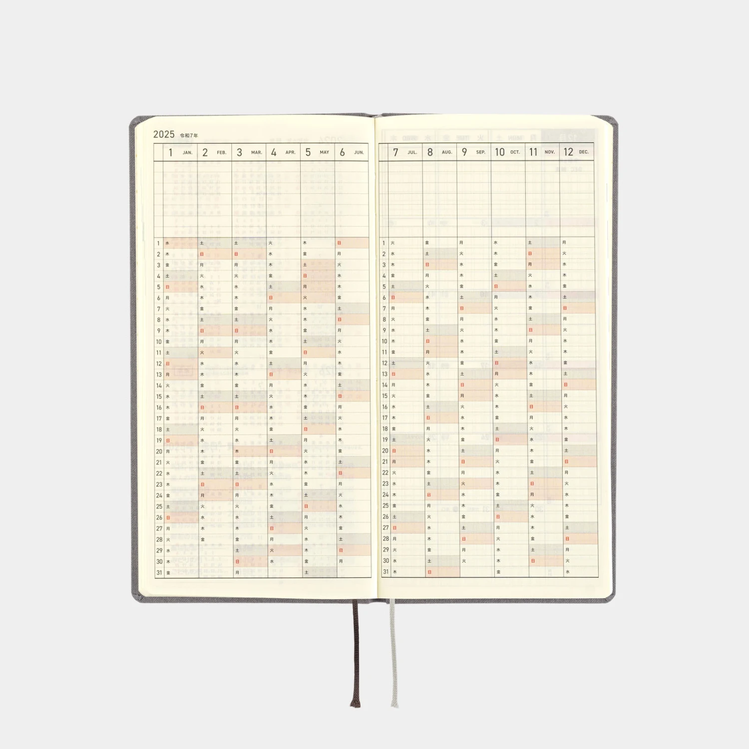La serie Colors di Hobonichi Weeks offre agli utenti schemi di colori semplici ma unici, con una solida rilegatura e un tessuto della copertina piacevole al tatto. Smoke Gray è una cover dal colore grigio chic. Anche la lamina dell’anno 2025 stampata sulla copertina è di un grigio simile, il che la rende una combinazione di diverse tonalità di grigio. La colorazione di base si adatta a qualsiasi outfit e sarebbe fantastica per l’uso al lavoro.