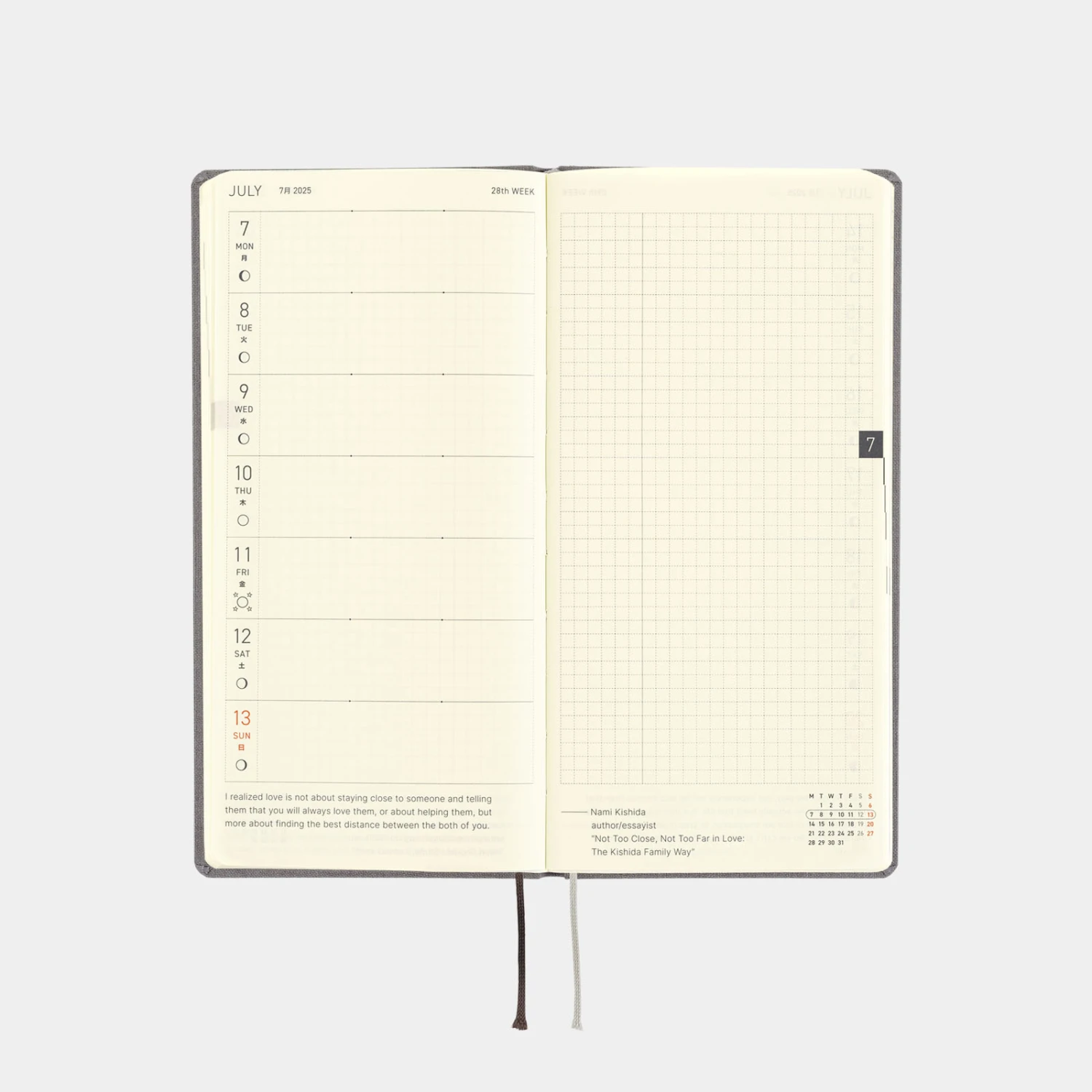 L’agenda settimanale ha spazio per scrivere piani o annotazioni di diario ed ha anche 69 pagine di promemoria con carta a quadretti (73 pagine nell’edizione inglese). Nella parte finale del libro ci sono pagine bonus, tra cui Sample Symbols and Icons e Oodles of Noodles. L’agenda Hobonichi Techo Weeks è disponibile in inglese o giapponese. Se ti piace questa cover, puoi scegliere la lingua che preferisci.