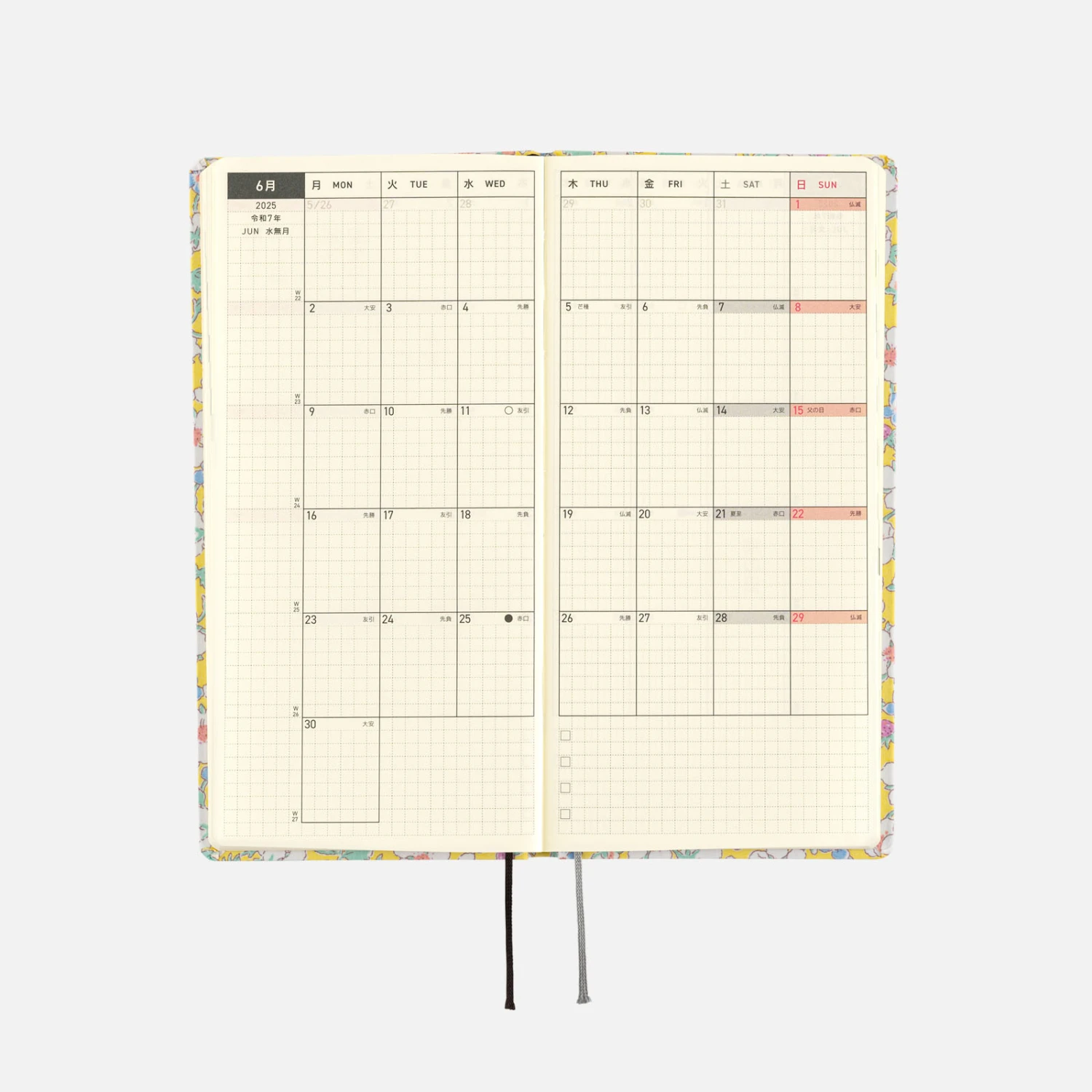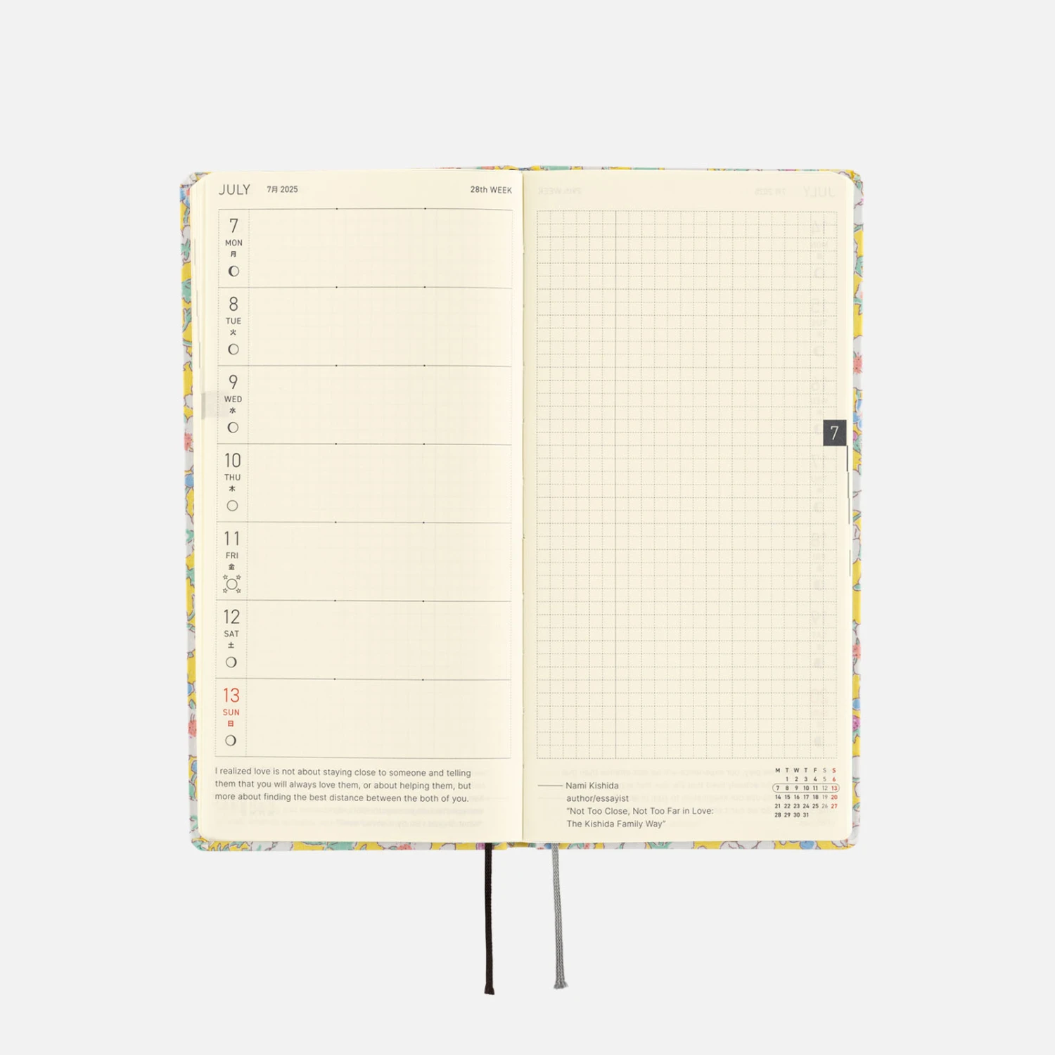 L’agenda settimanale ha spazio per scrivere piani o annotazioni di diario ed ha anche 69 pagine di promemoria con carta a quadretti (73 pagine nell’edizione inglese). Nella parte finale del libro ci sono pagine bonus, tra cui Sample Symbols and Icons e Oodles of Noodles. L’agenda Hobonichi Techo Weeks è disponibile in inglese o giapponese. Se ti piace questa cover, puoi scegliere la lingua che preferisci.