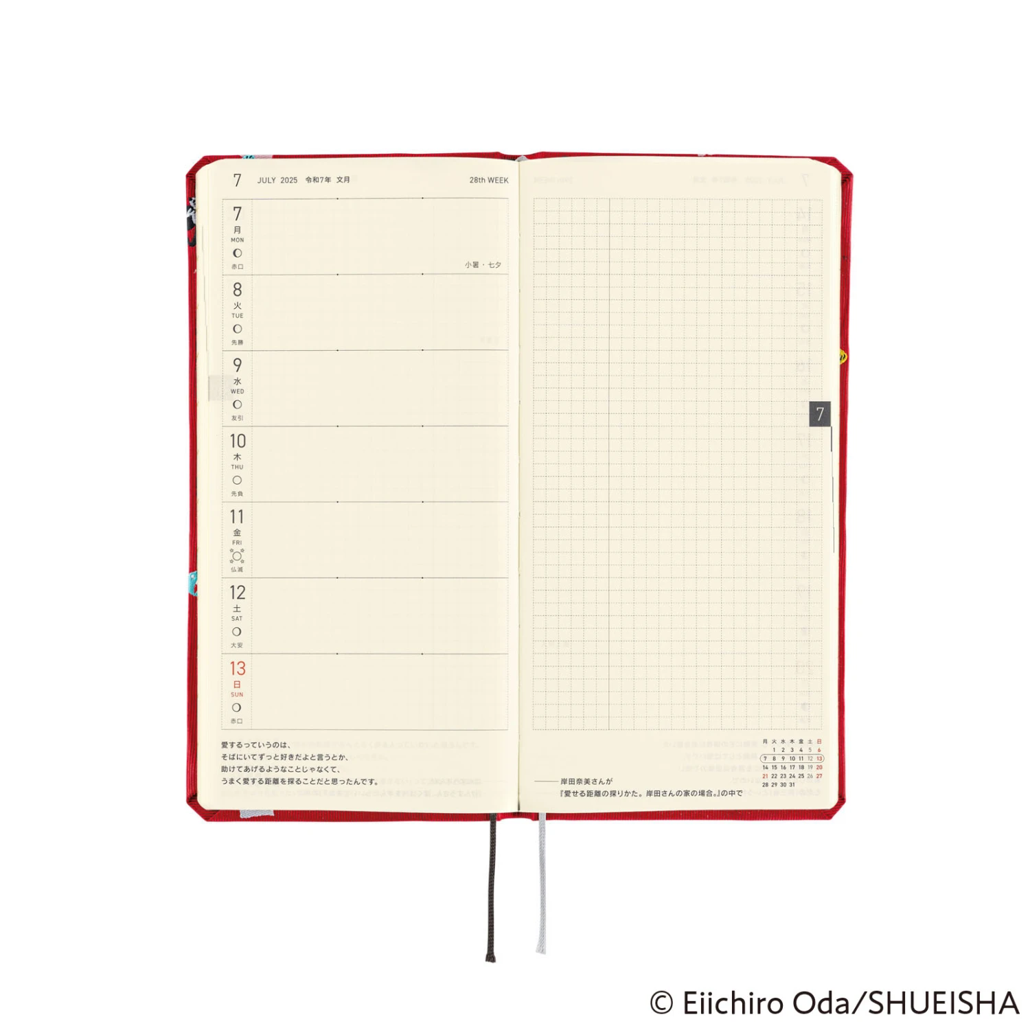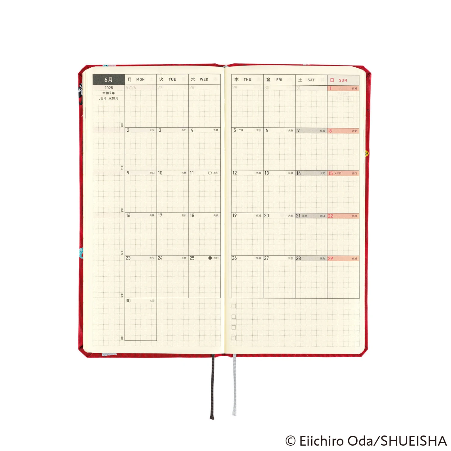 Hobonichi presenta una nuova collaborazione con ONE PIECE Magazine che si tuffa nel mondo della serie manga di successo One Piece. Hobonichi Weeks DON! è realizzata in un allegro tessuto rosso brillante disseminato di oggetti significativi del mondo di One Piece, tra cui il cappello di paglia del personaggio principale Luffy, la lumaca telepatica Den Den Mushi e il Log Pose che mostra le direzioni.