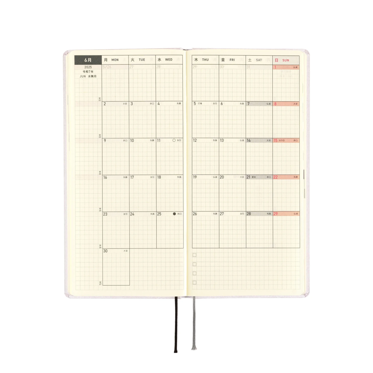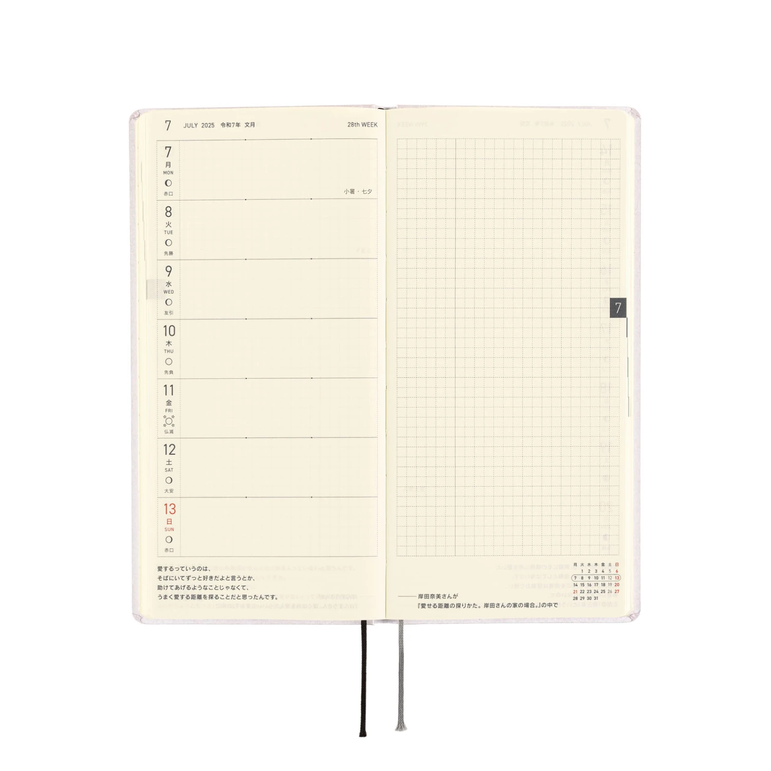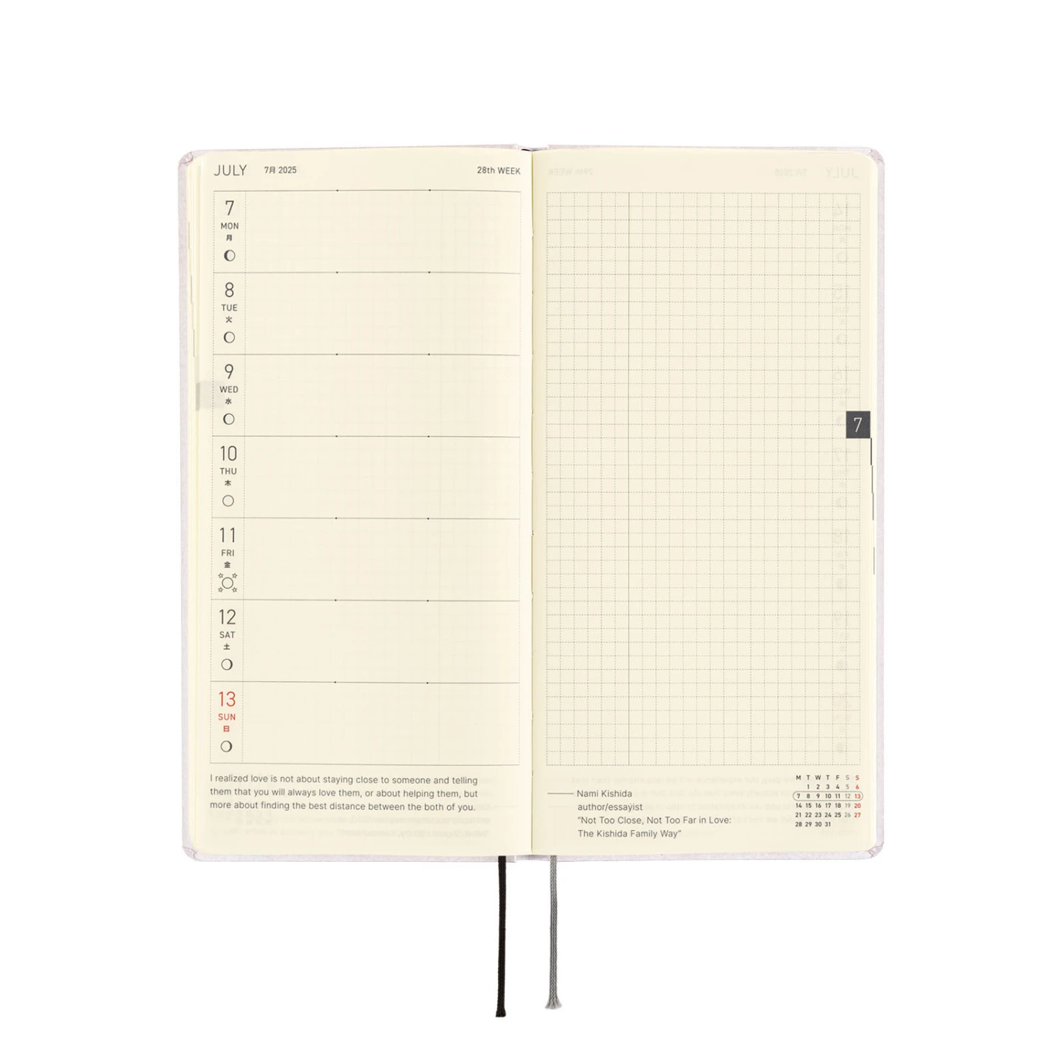 L’agenda settimanale ha spazio per scrivere piani o annotazioni di diario ed ha anche 69 pagine di promemoria con carta a quadretti (73 pagine nell’edizione inglese). Nella parte finale del libro ci sono pagine bonus, tra cui Sample Symbols and Icons e Oodles of Noodles. L’agenda Hobonichi Techo Weeks è disponibile in inglese o giapponese. Se ti piace questa cover, puoi scegliere la lingua che preferisci.