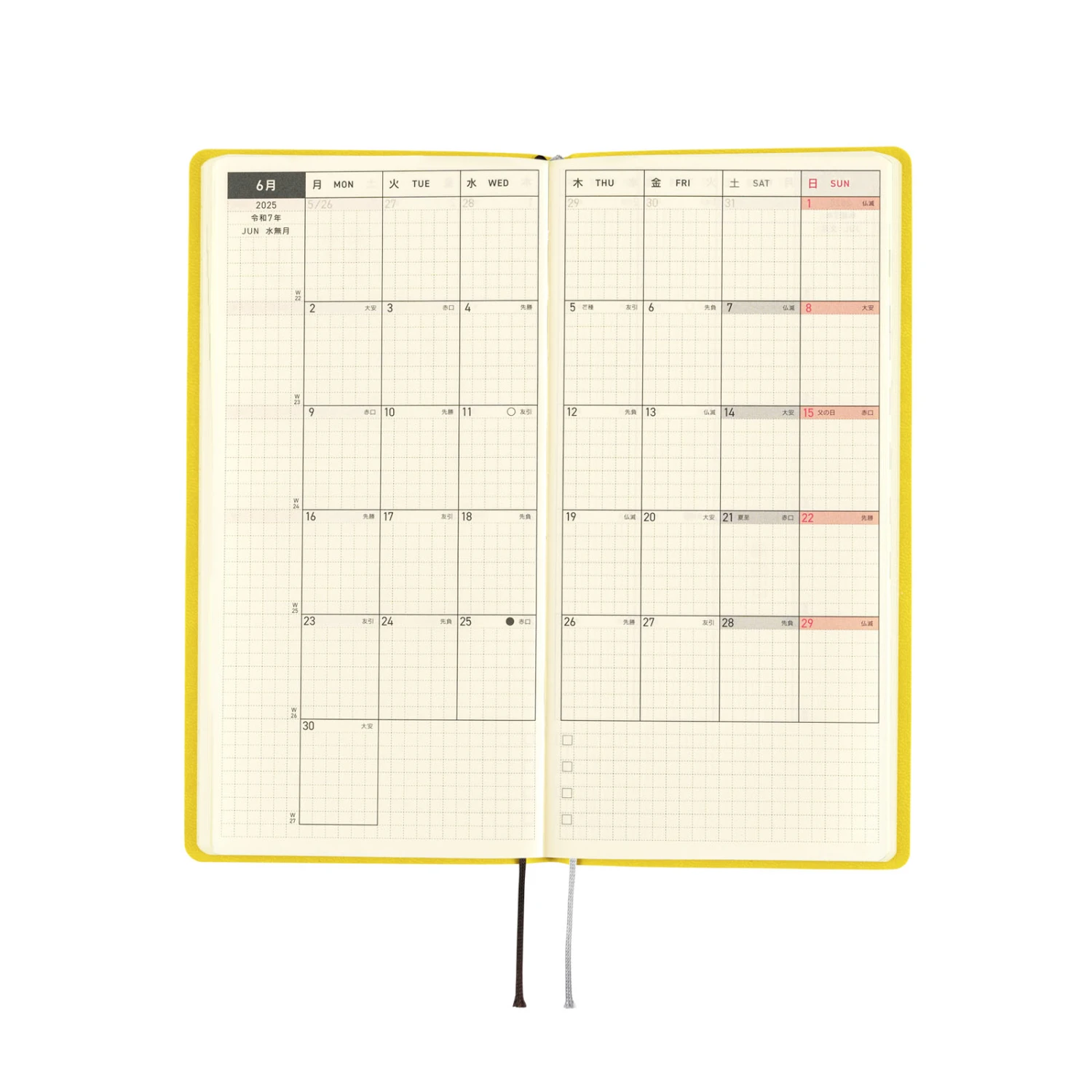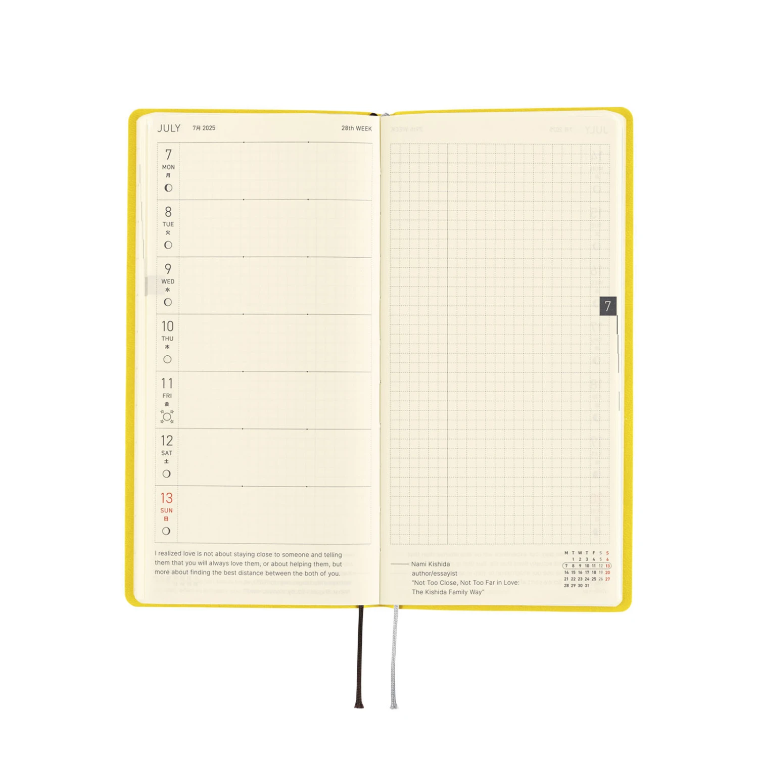 L’agenda settimanale ha spazio per scrivere piani o annotazioni di diario ed ha anche 69 pagine di promemoria con carta a quadretti (73 pagine nell’edizione inglese). Nella parte finale del libro ci sono pagine bonus, tra cui Sample Symbols and Icons e Oodles of Noodles. L’agenda Hobonichi Techo Weeks è disponibile in inglese o giapponese. Se ti piace questa cover, puoi scegliere la lingua che preferisci.
