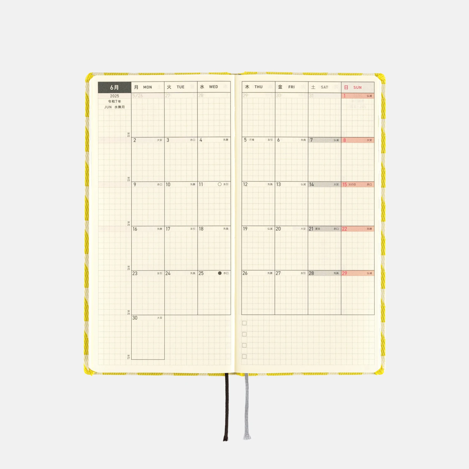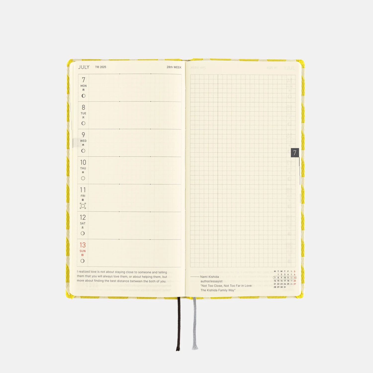 L’agenda settimanale ha spazio per scrivere piani o annotazioni di diario ed ha anche 69 pagine di promemoria con carta a quadretti (73 pagine nell’edizione inglese). Nella parte finale del libro ci sono pagine bonus, tra cui Sample Symbols and Icons e Oodles of Noodles. L’agenda Hobonichi Techo Weeks è disponibile in inglese o giapponese. Se ti piace questa cover, puoi scegliere la lingua che preferisci.
