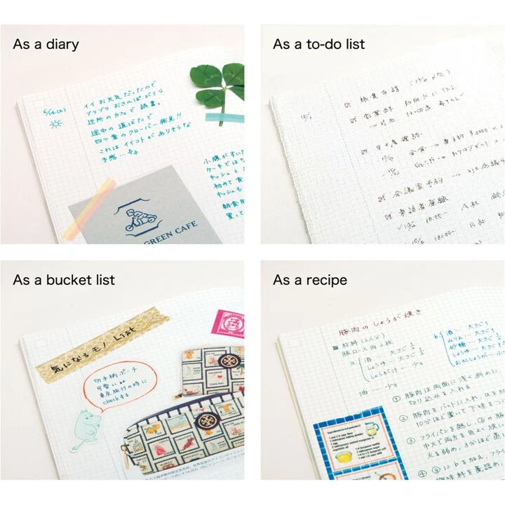 Kokuyo Jibun Techo mini Idea può essere utilizzato con o senza agenda Jibun Techo. Un quaderno per pensieri, idee, osservazioni e molto altro ancora. Puoi usare questo refill come diario giornaliero, annotare idee, elenco di raccolte, diario di lettura, appunti o disegni. La vista con la linea verticale a sinistra ti permette di aggiungere date e titoli.