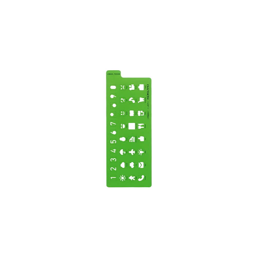 Kokuyo Jibun Techo Stencil Icon ti permetterà di decorare la tua agenda con simboli utili come numeri, icone per meteo, viaggi, faccine e così via.