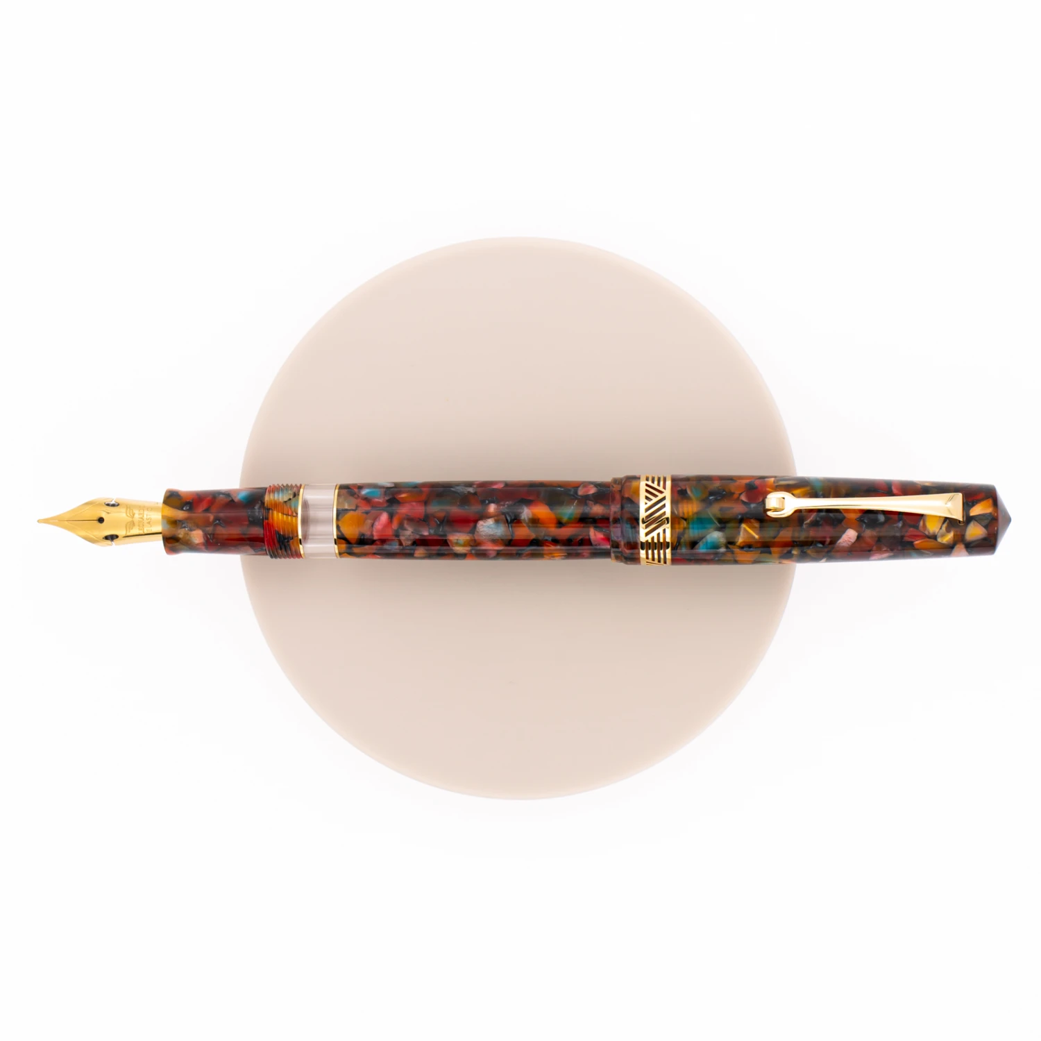 Leonardo Momento Magico Millefiori & Oro è una penna stilografica prodotta a mano nelle officine Leonardo con una resina marmorizzata marrone abbinata a finiture dorate.