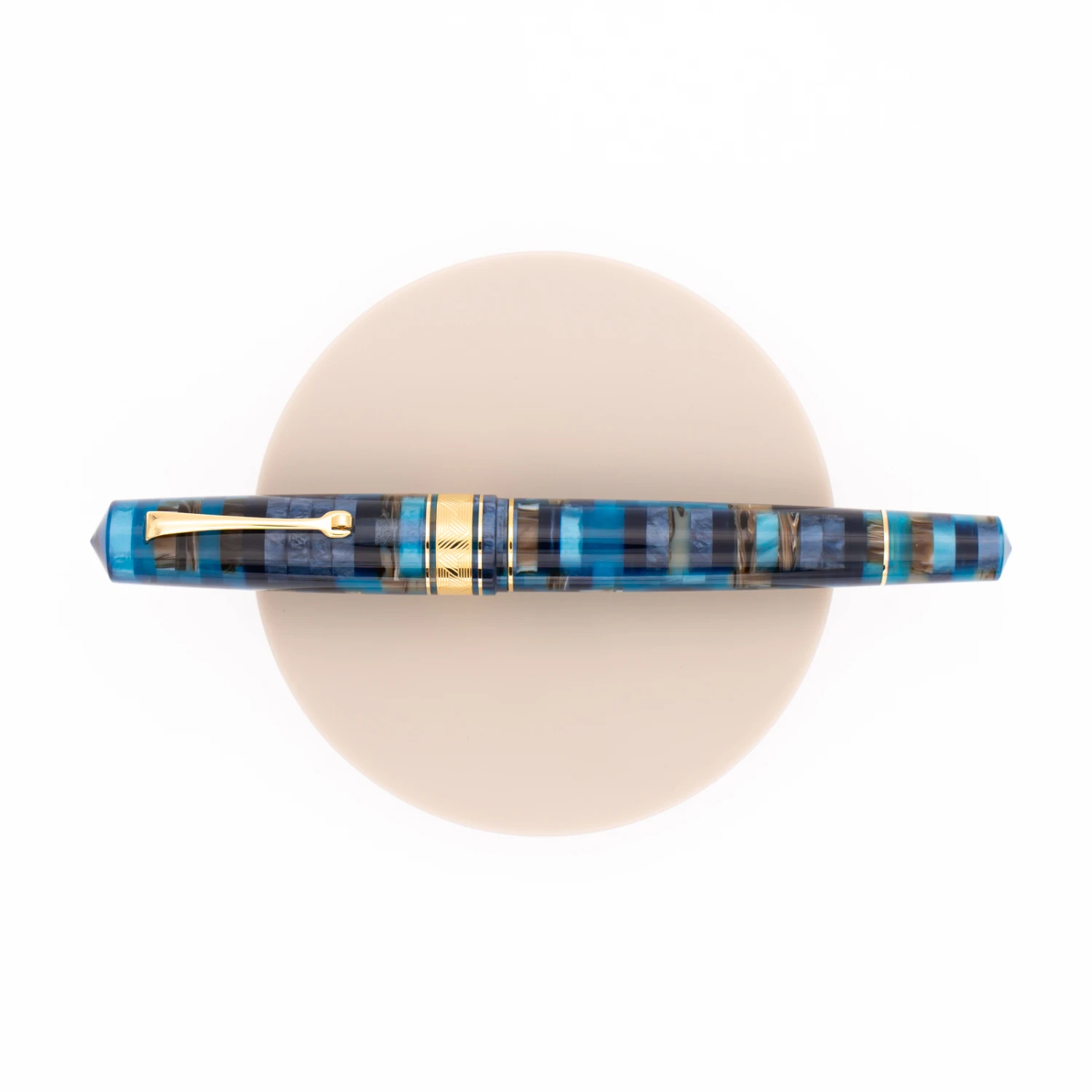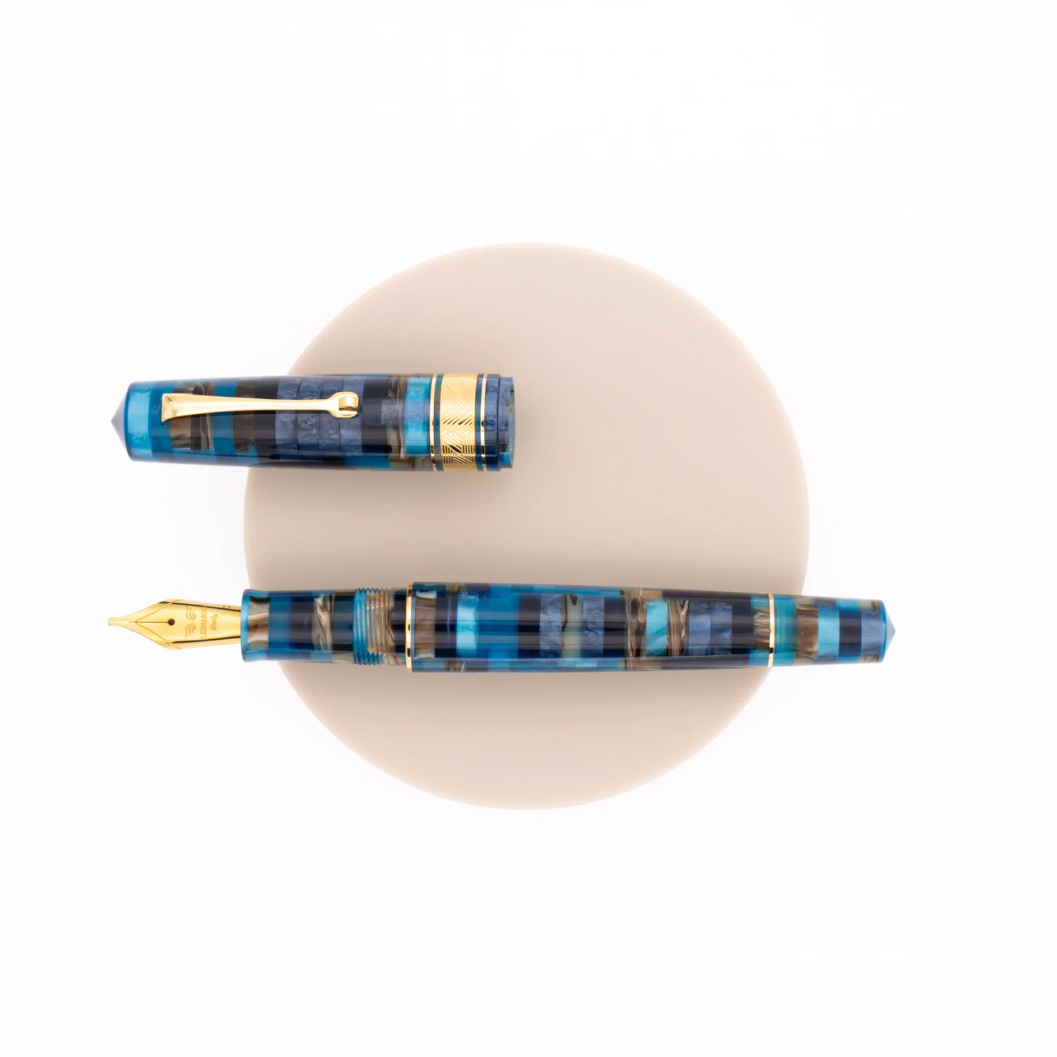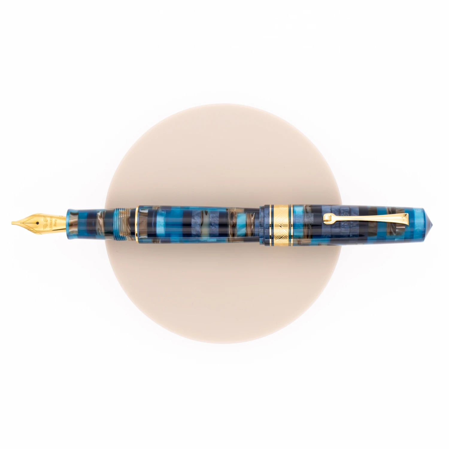 Leonardo Momento Zero Grande Mosaico Hawaii & Oro è caratterizzata da un pennino in acciaio con conduttore in ABS. L’anello del cappuccio è decorato con pantografo tridimensionale e le finiture in metallo sono placcate oro.