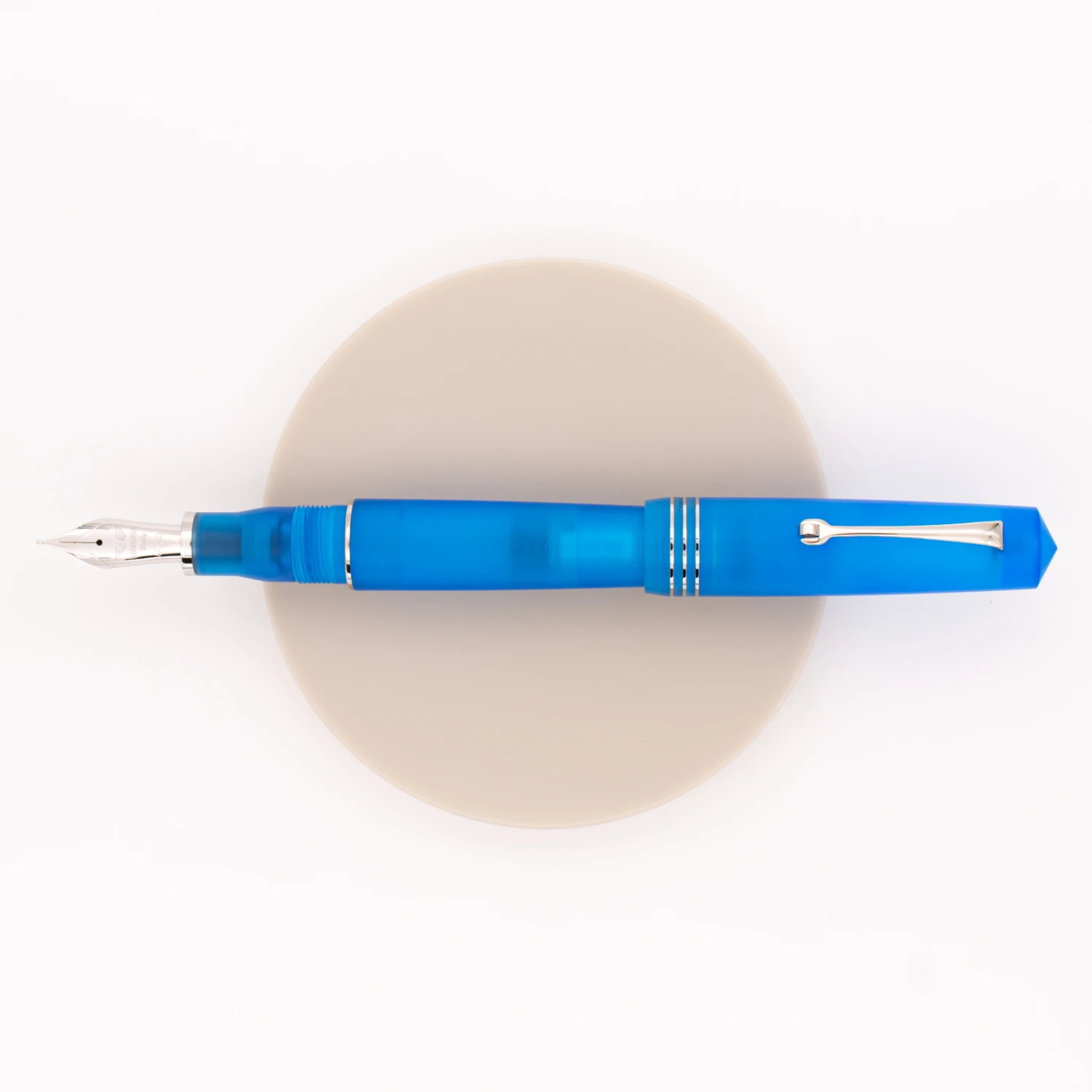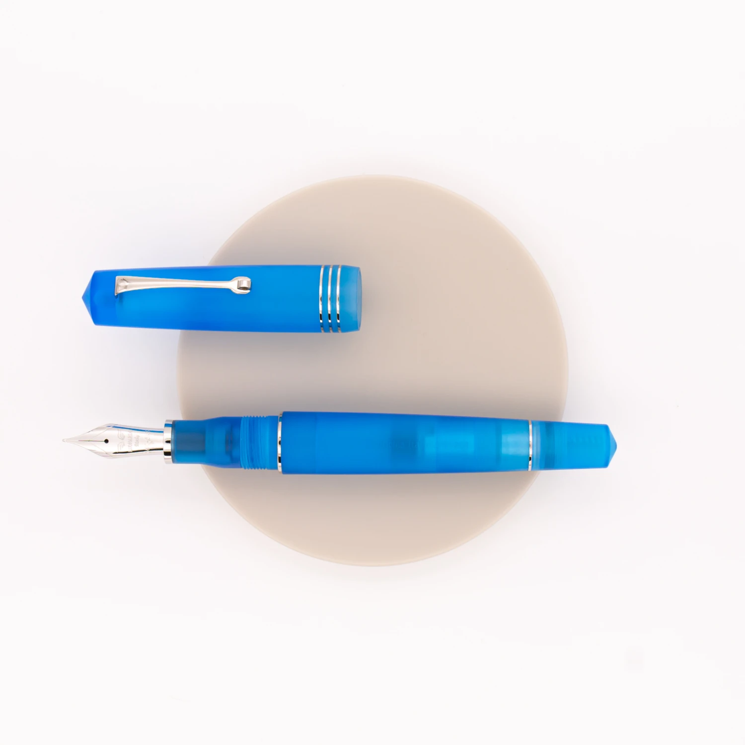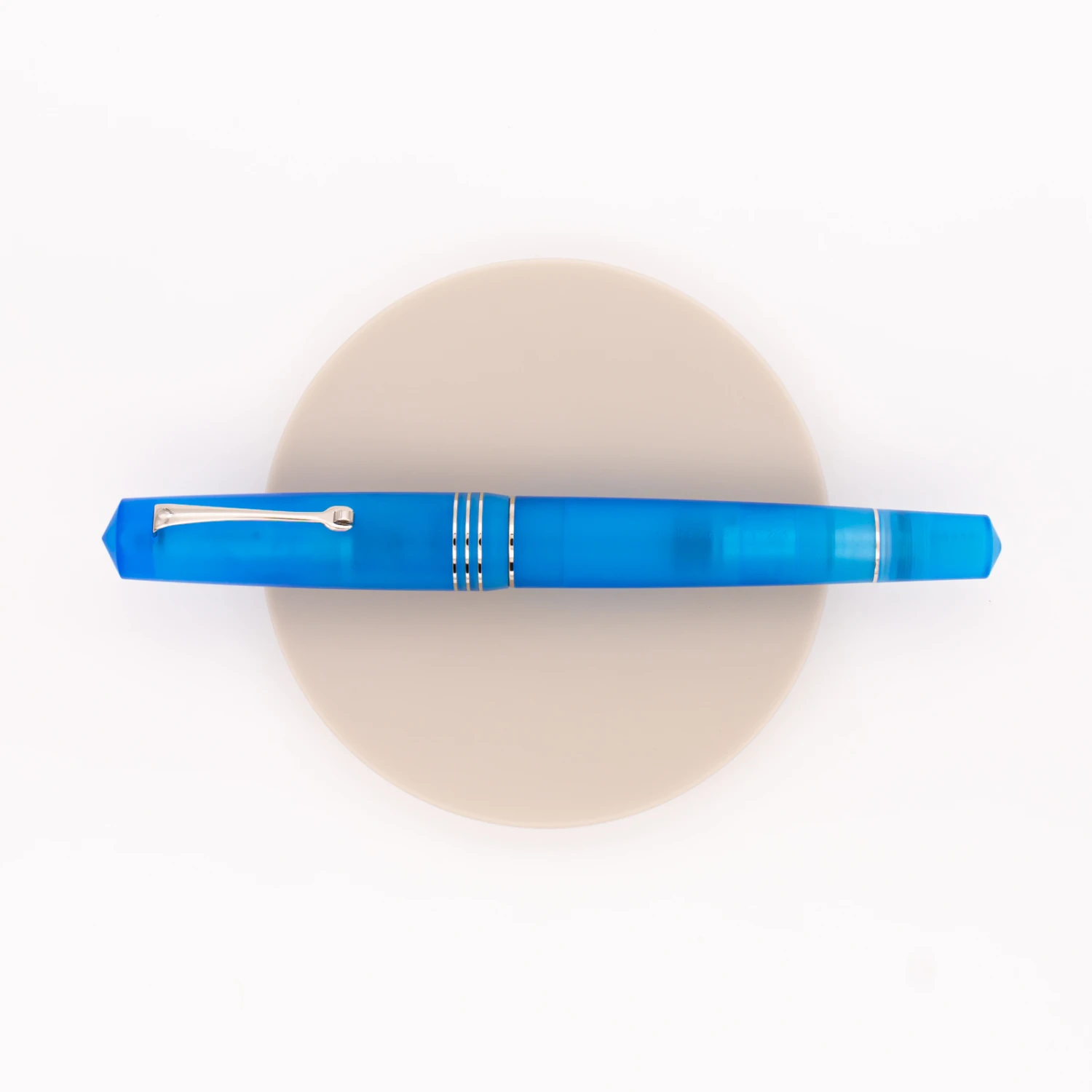 Blu Acqua & Rodio è la resina semi-trasparente sulla tonalità del blu con finiture rodiate. Pennino in acciaio e conduttore in ebanite.