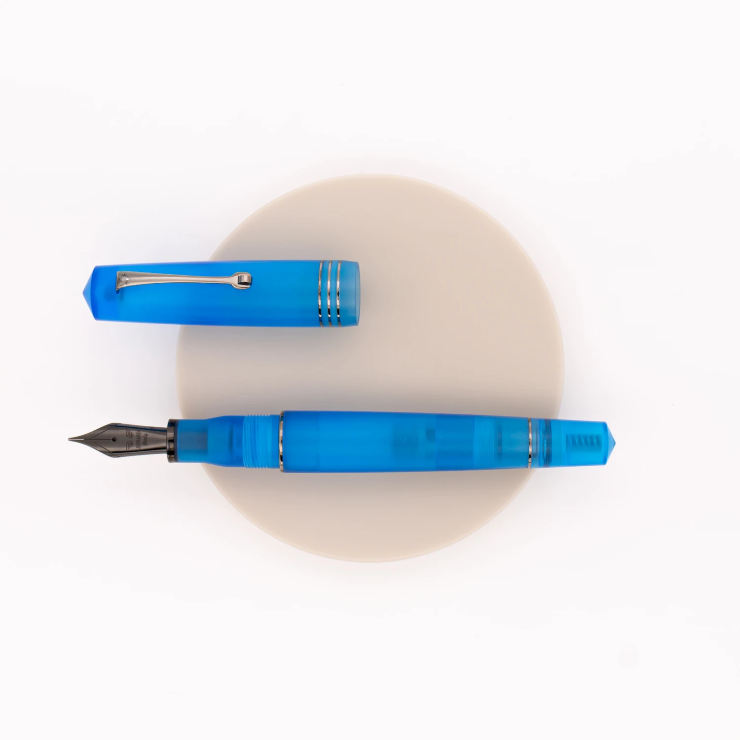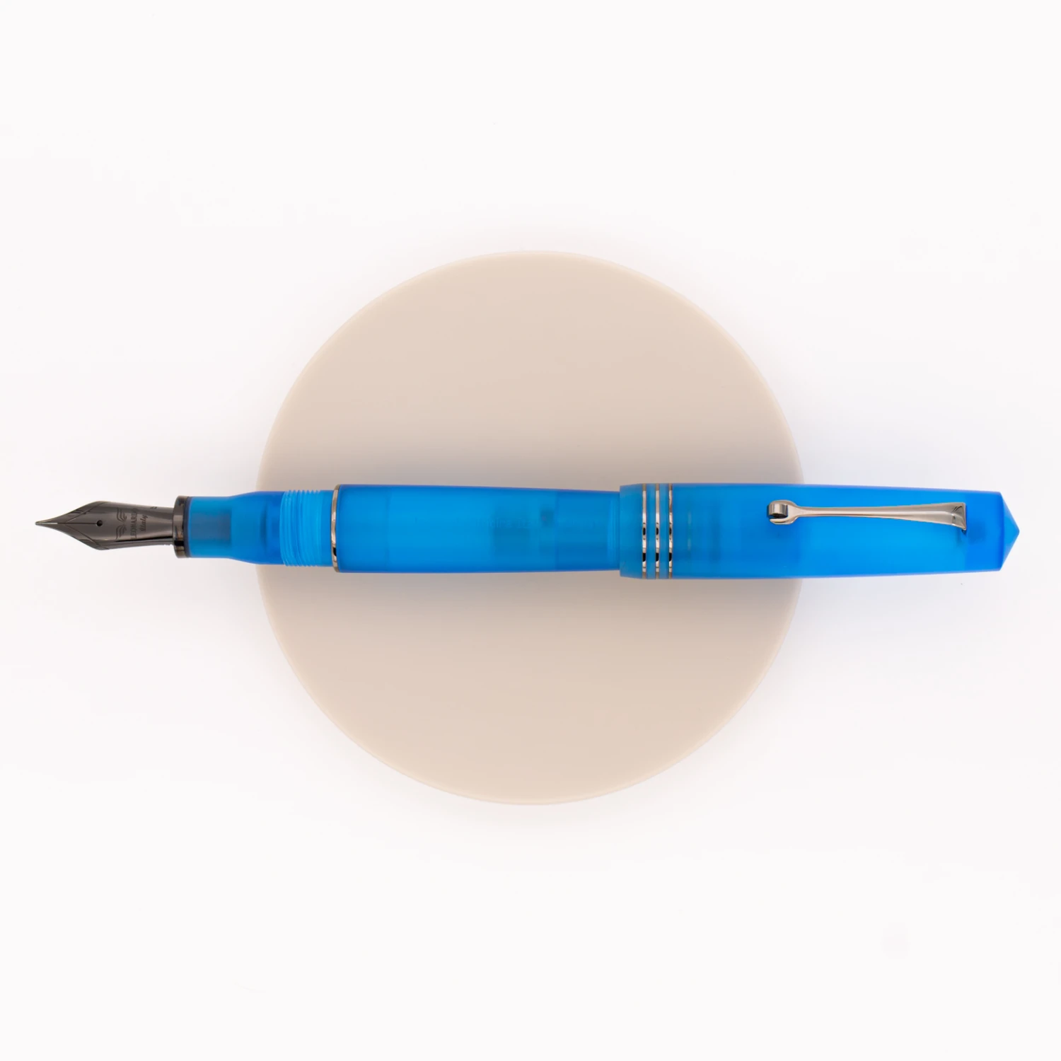 Blu Acqua & Rutenio è la resina semi-trasparente sulla tonalità del blu con finiture nero rutenio. Pennino in acciaio e conduttore in ebanite.