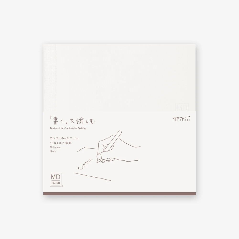MD Paper Notebook Cotton A5 Square Blank ha le dimensioni di un fotolibro. Aprilo e lo spazio lungo e stretto stimolerà la tua immaginazione. Che tu stia scrivendo, illustrando o creando mappe concettuali, questo formato non convenzionale lascia correre libere le tue idee.