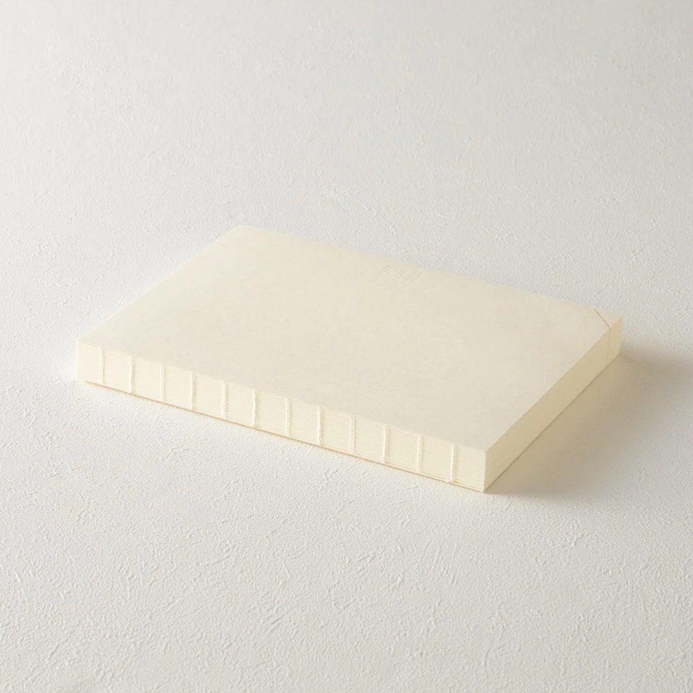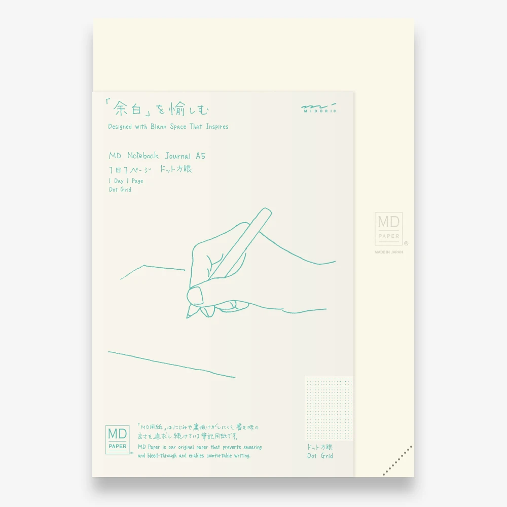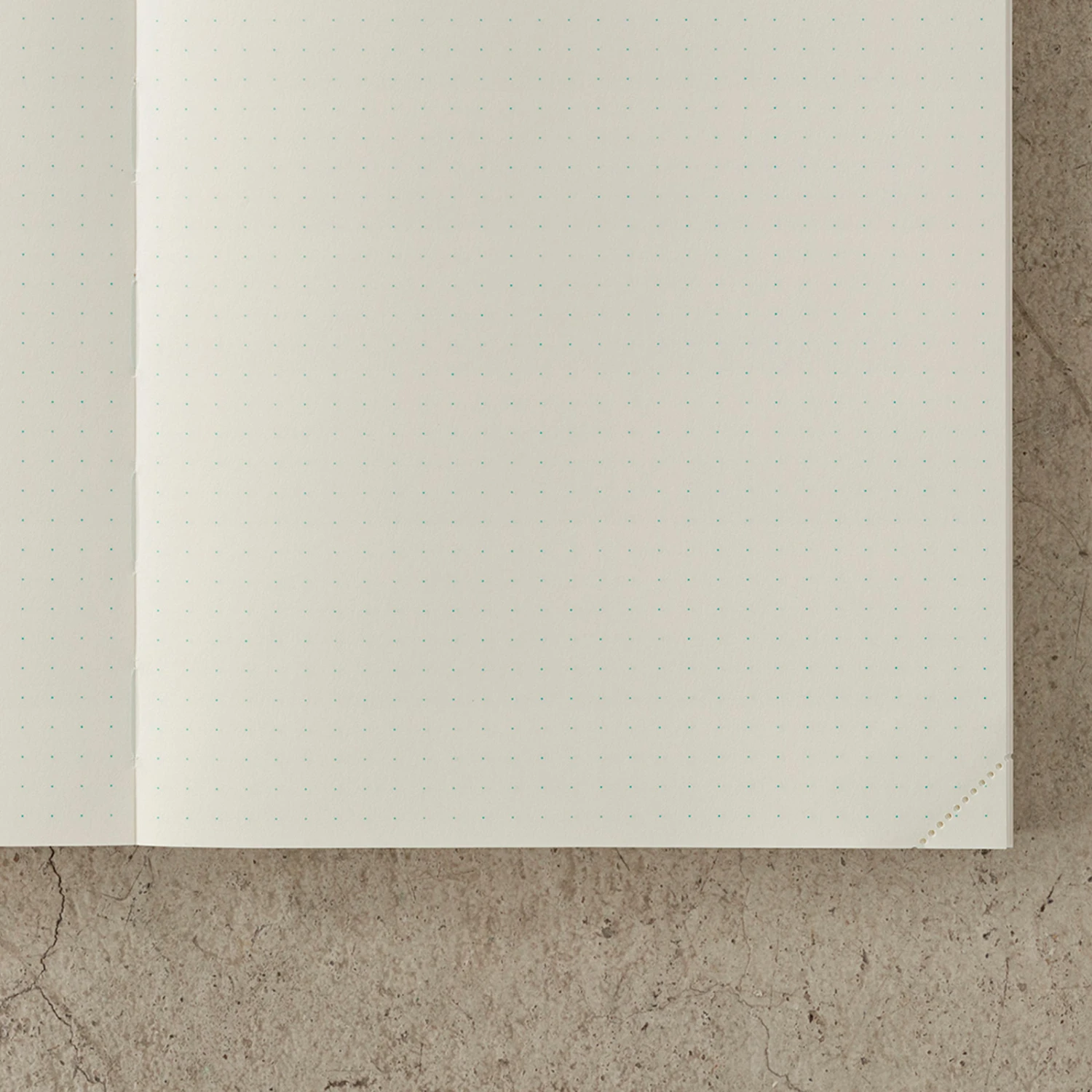 La rigatura Dot da 5 mm fornisce una guida pratica sia per scrivere che per disegnare. Troverai anche due punti più grandi per scrivere una data. Le cuciture sul dorso sono visibili e fatte con lo stesso colore della rigatura interna del notebook.