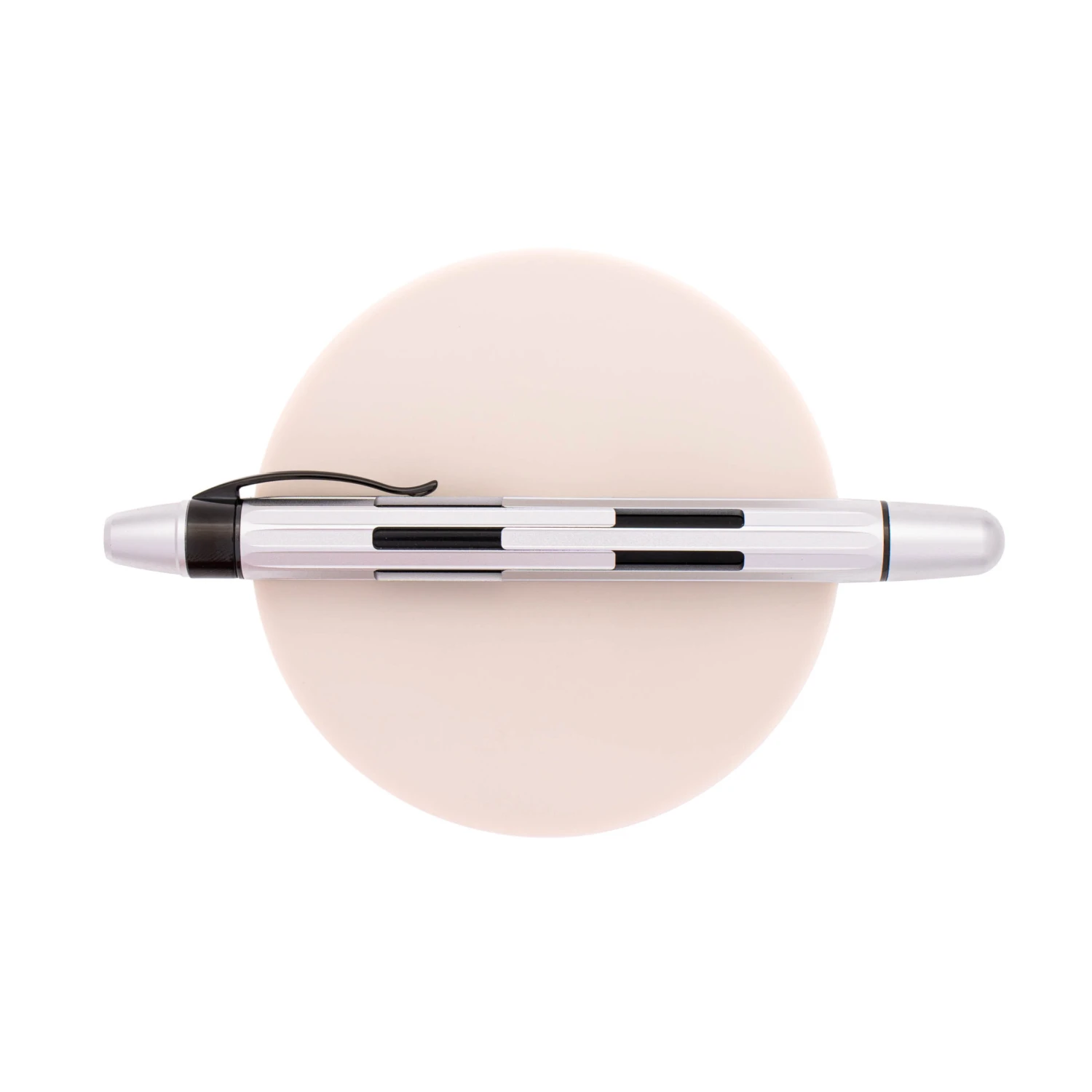 Nahvalur Eclipse Iridium presenta un corpo in alluminio argento con parti in metallo nere. E’ equipaggiata di un pennino in acciaio e si ricarica tramite cartucce ad attacco standard internazionale. La clip rimovibile è studiata per offrire un’esperienza di scrittura confortevole, indipendentemente dalle preferenze. La forma sfaccettata assicura che, anche con la clip rimossa, non sia necessario alcun fermo per evitare il rotolamento su superfici piane.