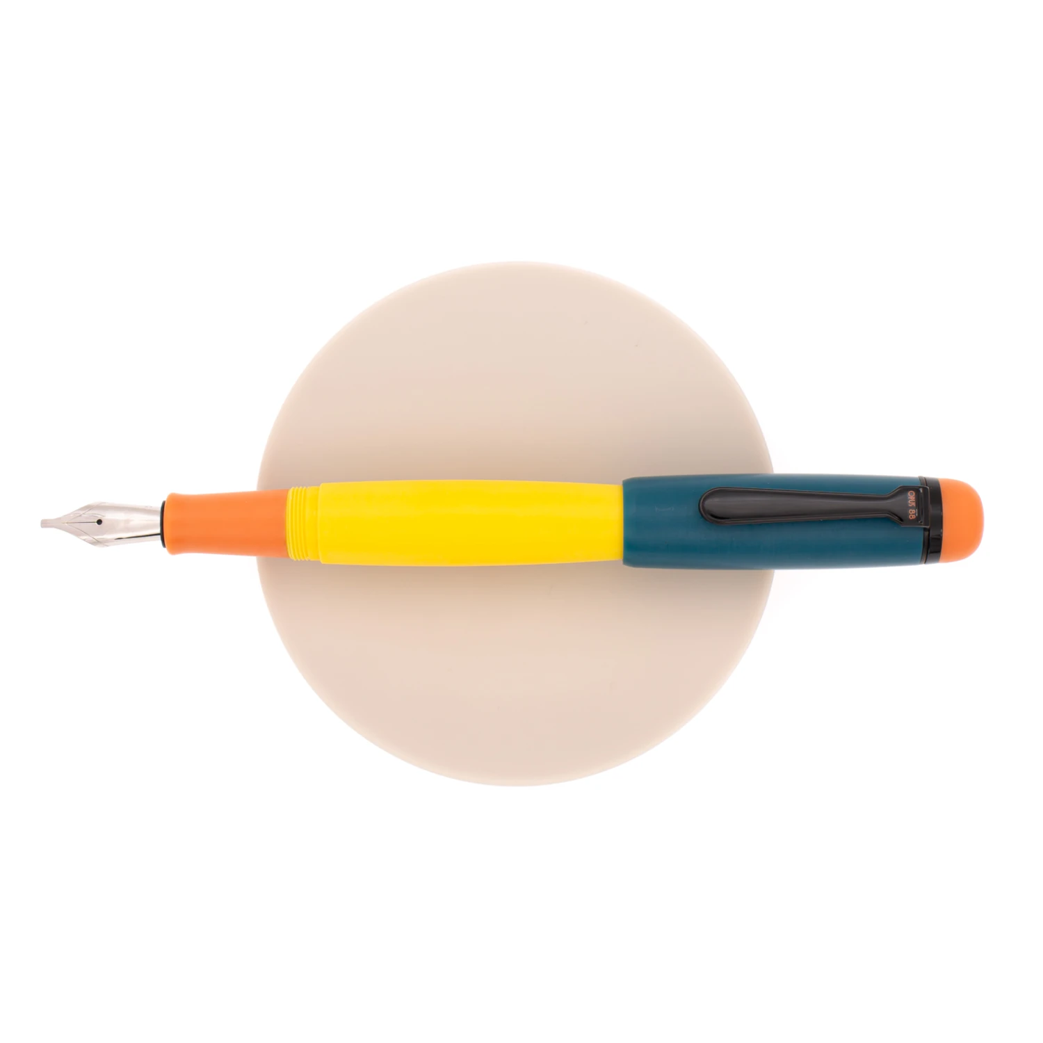 Opus 88 Omar Pumpkin è una penna stilografica di grandi dimensioni realizzata in resina satinata gialla per il corpo, blu per il cappuccio ed arancione per i dettagli di corpo e cappuccio. E’ equipaggiata di un pennino in acciaio JoWo #6.