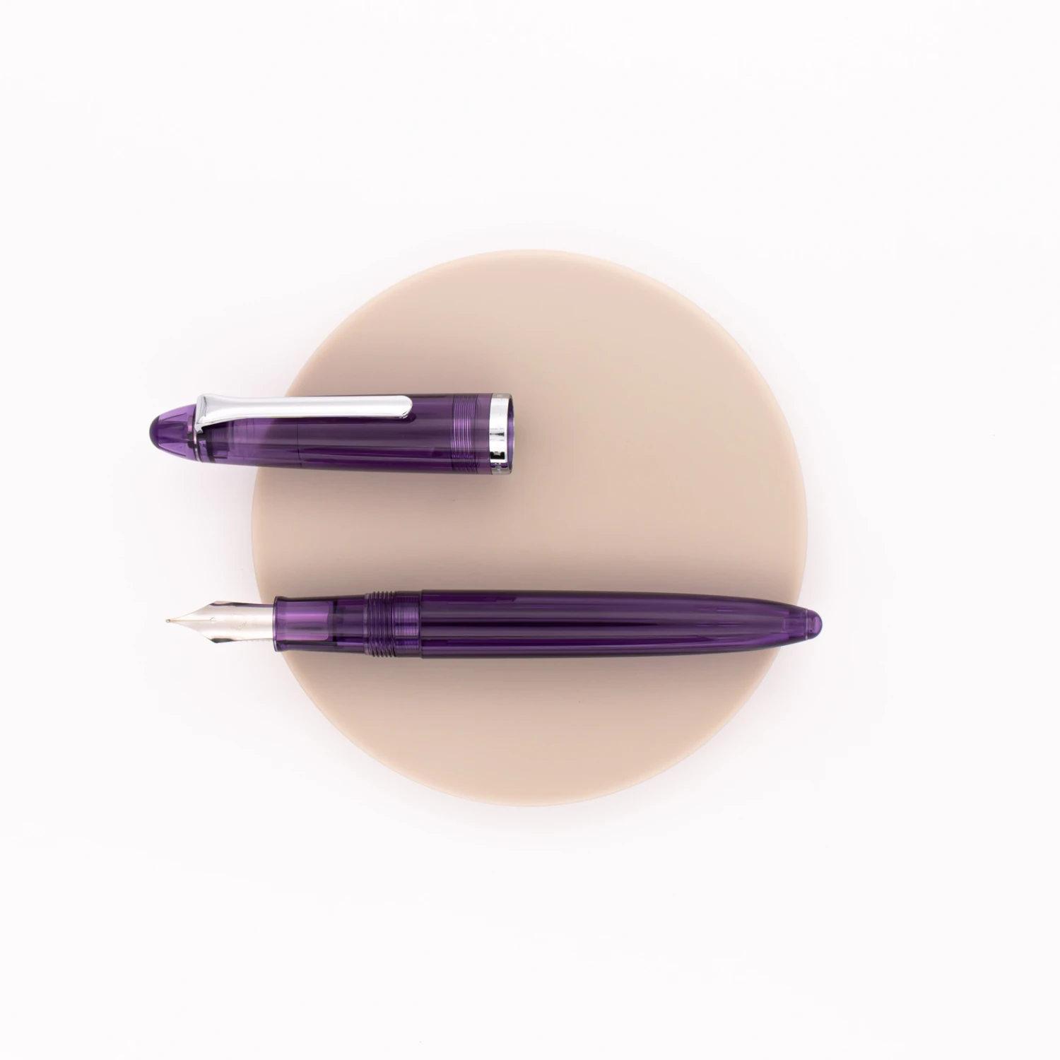 Sailor 1911 Compass Transparent Purple ha una resina semi-trasparente viola con finiture rodiate ed un pennino in acciaio FineMedium con feed trasparente. Il sistema di ricarica è cartucce/converter con attacco proprietario.