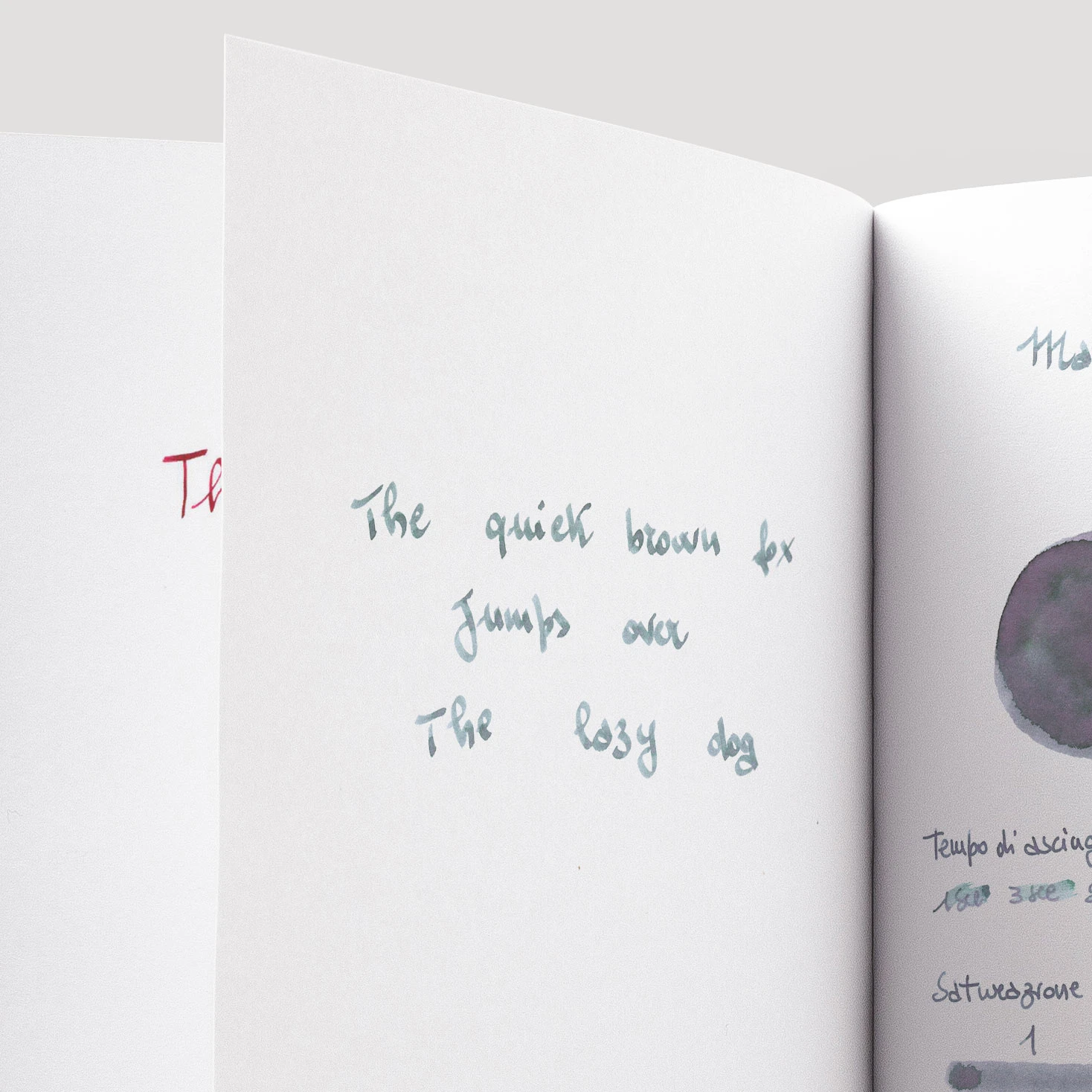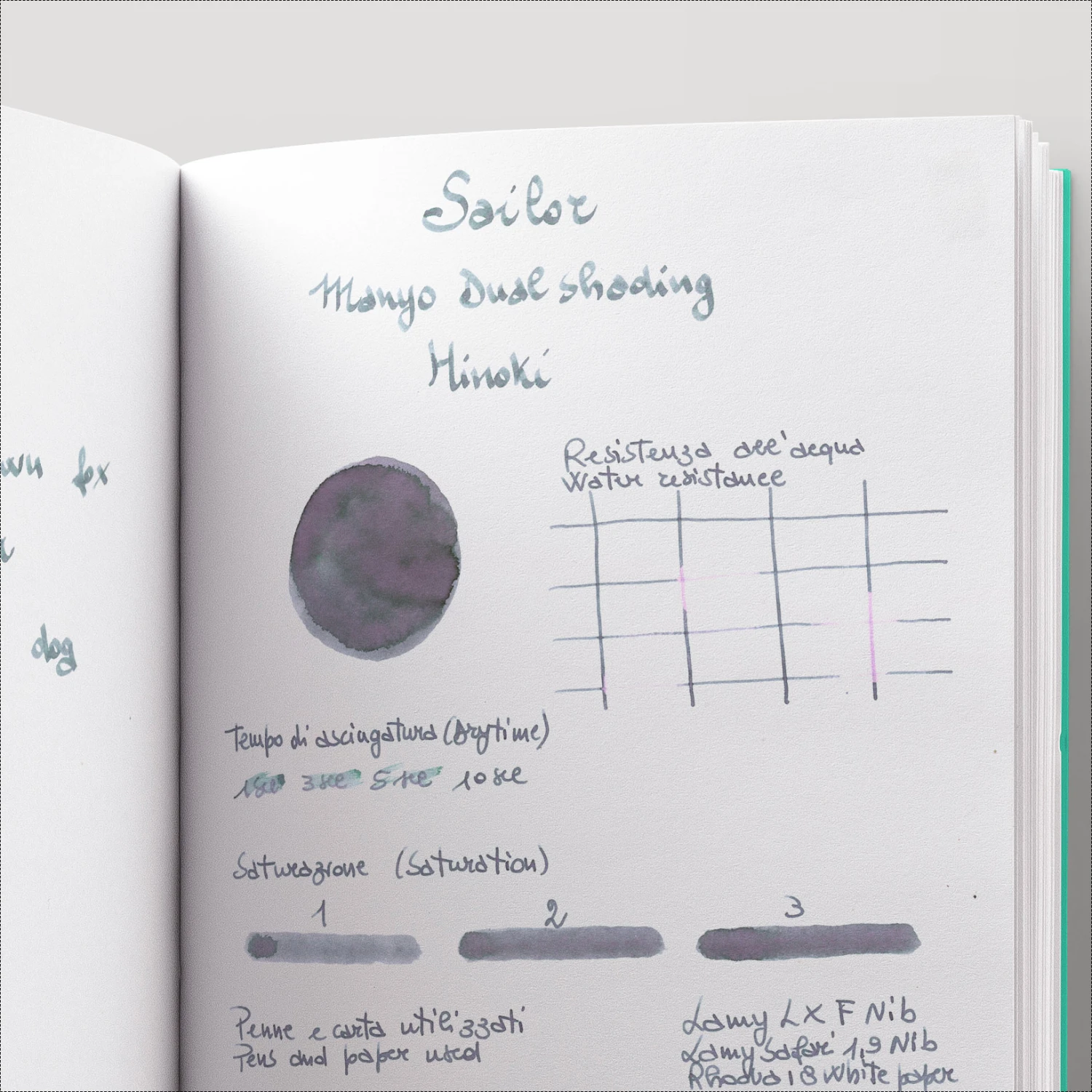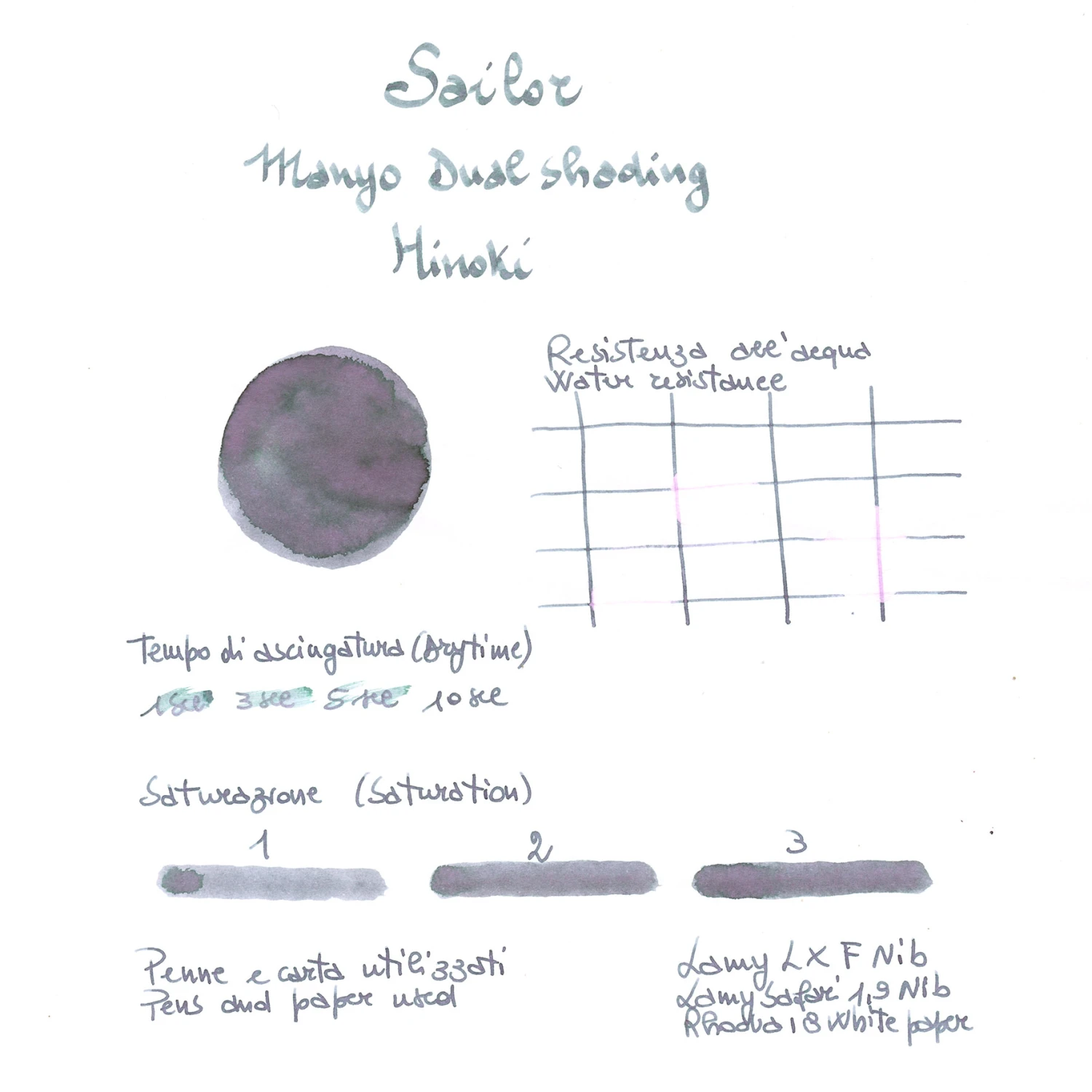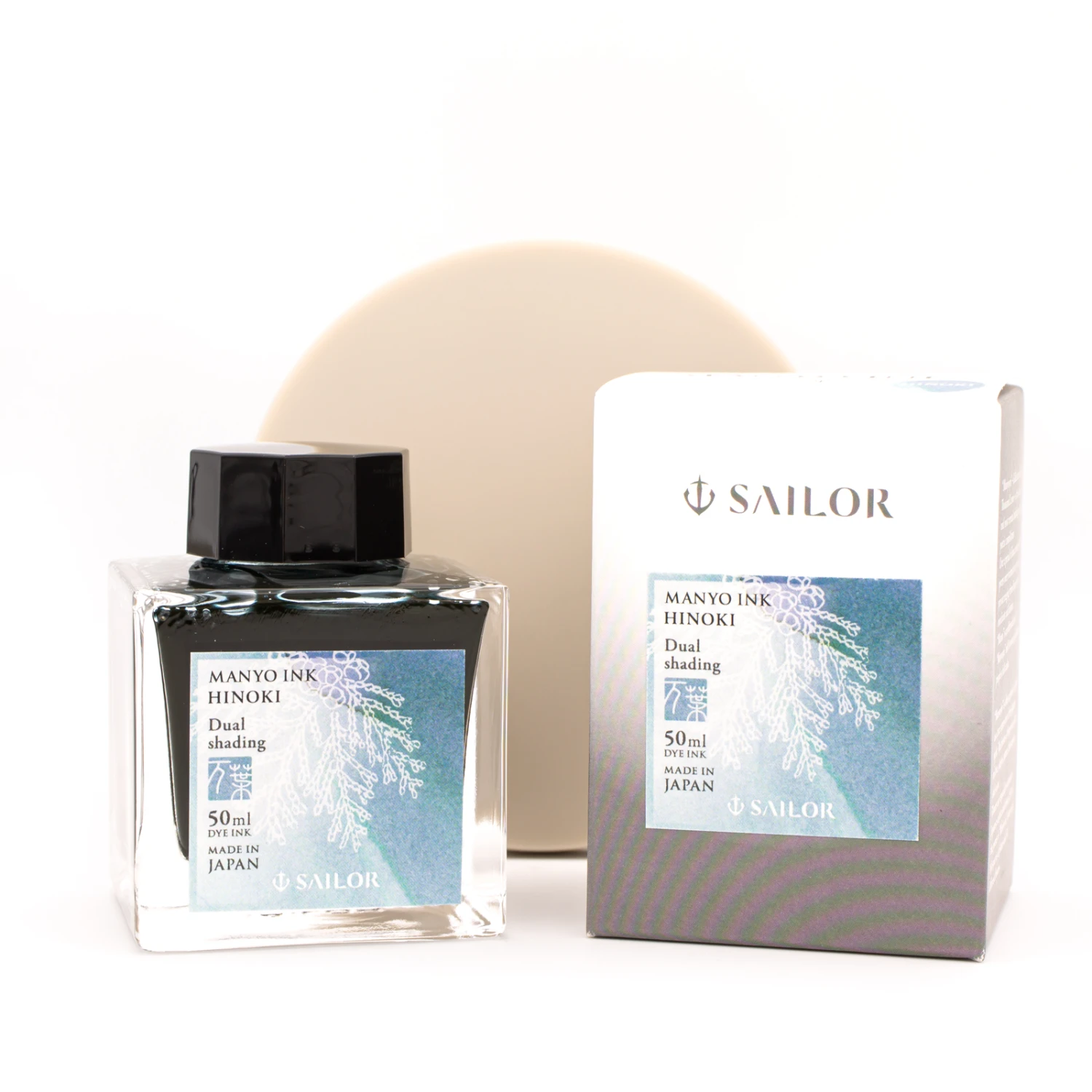 Sailor Manyo Dual Shading Hinoki è un inchiostro blu-grigio che sfuma in viola e verde. E’ contenuto in una bottiglia di vetro da 50 ml.