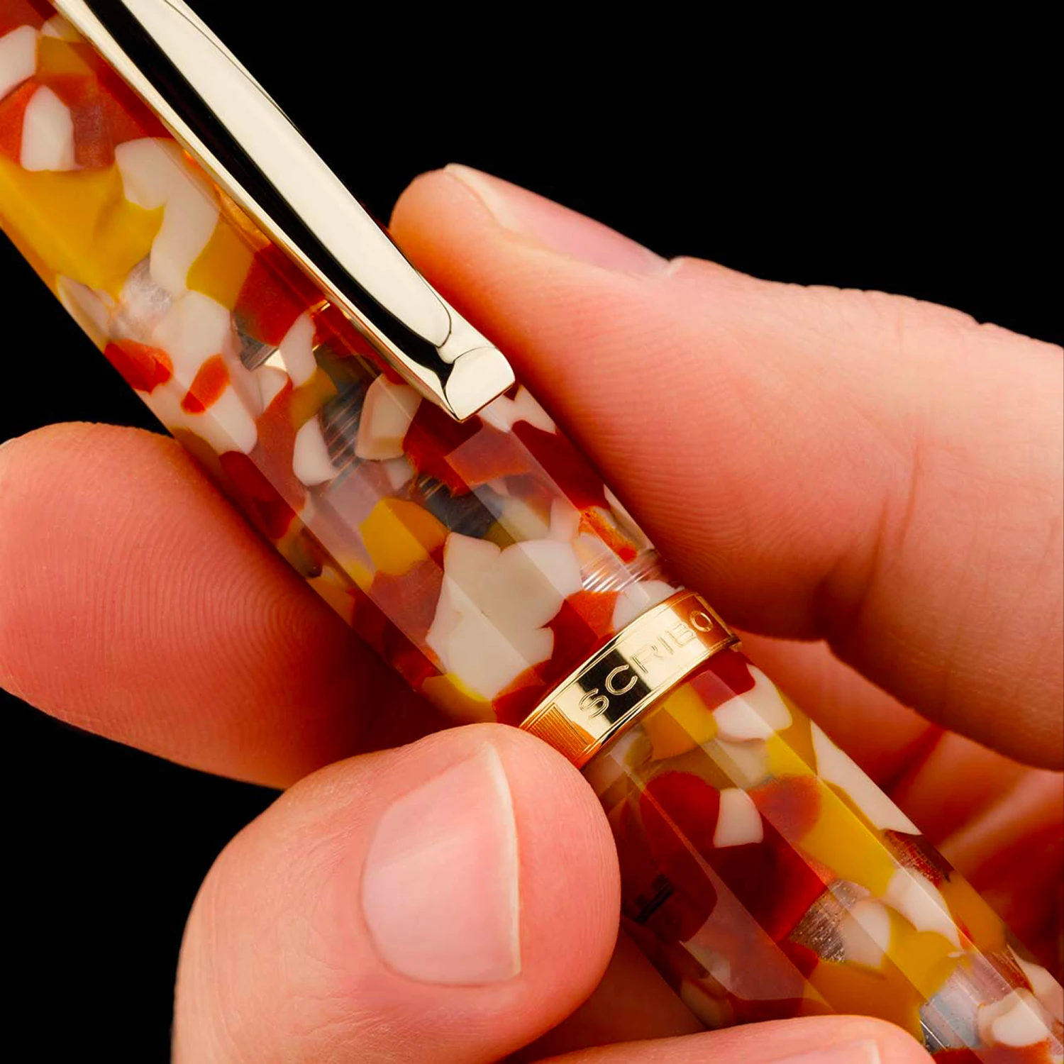 Realizzata in soli 150 esemplari numerati, Scribo Feel Sale di Volterra è dotata di pennino in oro 18kt, alimentatore in ebanite e sistema di caricamento a stantuffo. I pennini Flex invece sono in oro 14k. Una penna che trasforma la scrittura in un rito essenziale e autentico.