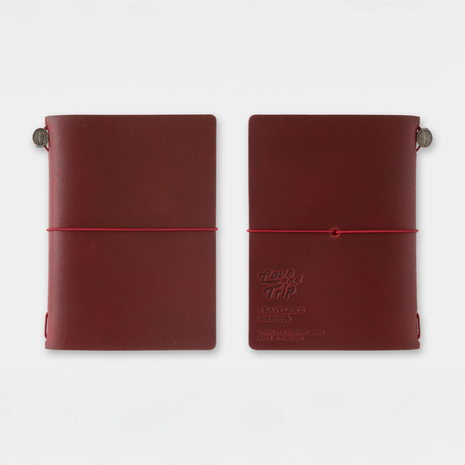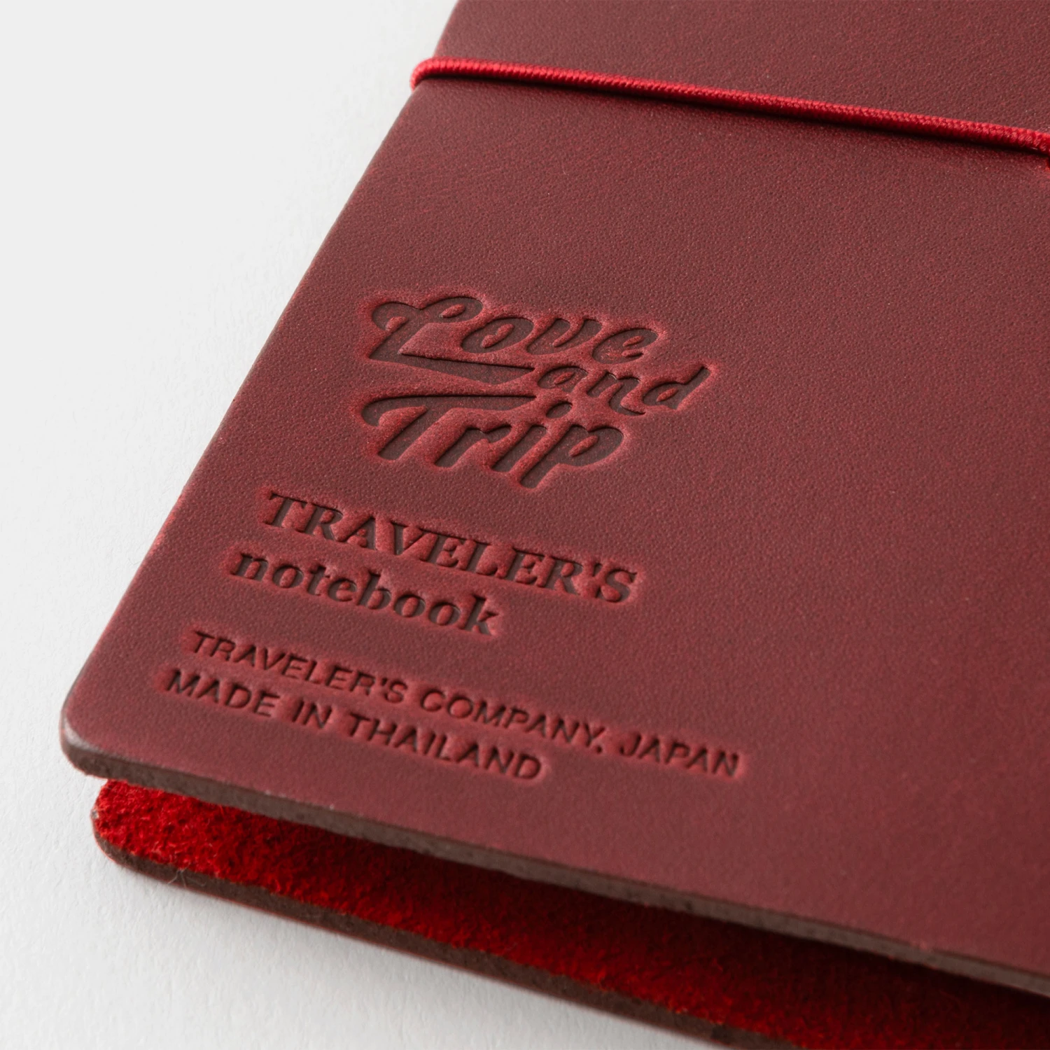 Il Traveler’s Notebook Passport Size Love and Trip presenta una pelle rosso scuro, quasi bordeaux. Si dice che il colore rosso significhi amicizia e le rose rosse simboleggiano l’amore. Il rosso è anche associato alla vita e alla passione ed è un colore che dà l’energia per iniziare un nuovo viaggio. Il logo LOVE AND TRIP è inciso sul retro dell’agenda mentre il sacchetto in cotone, realizzato con un materiale più pesante, è stampato con una frase a tema.