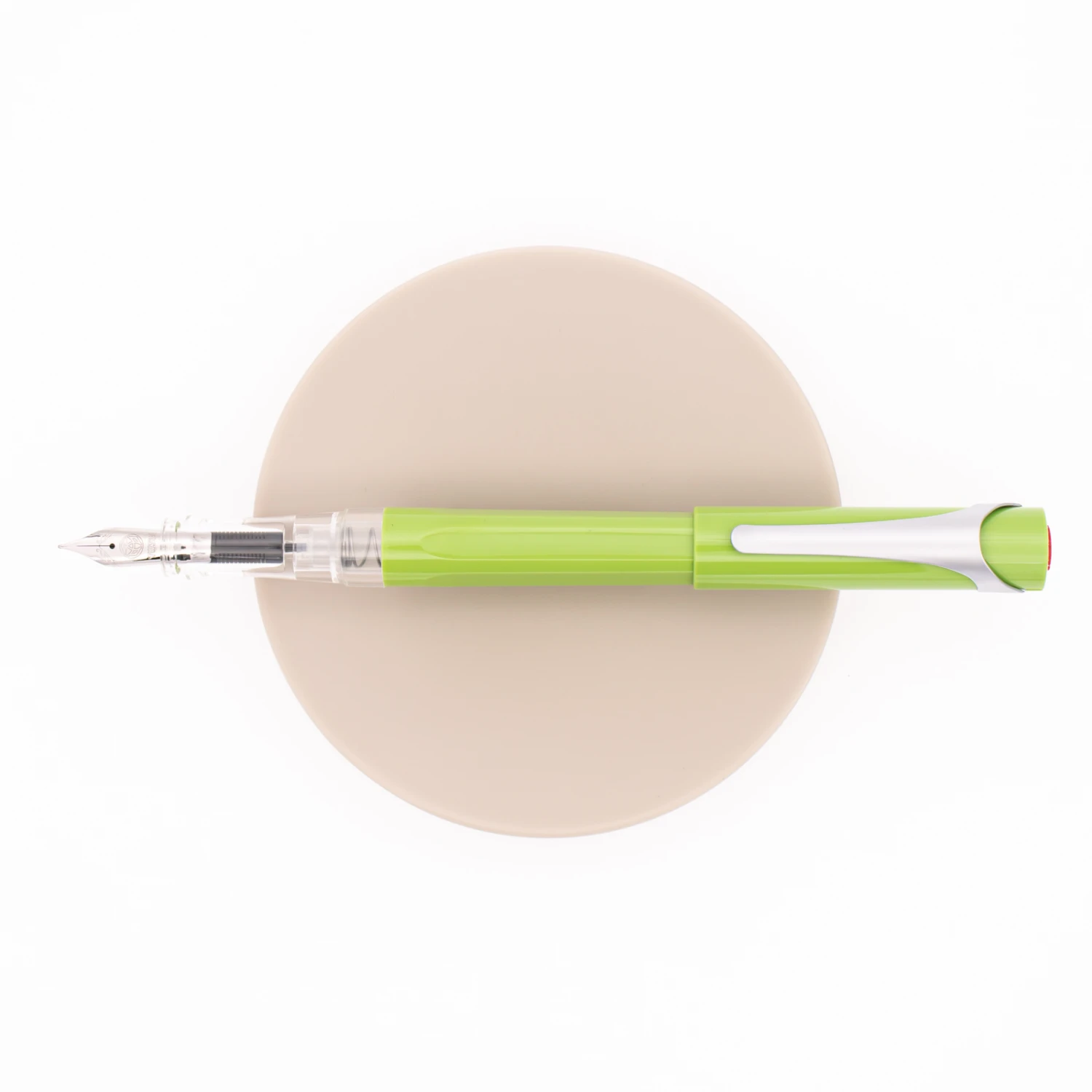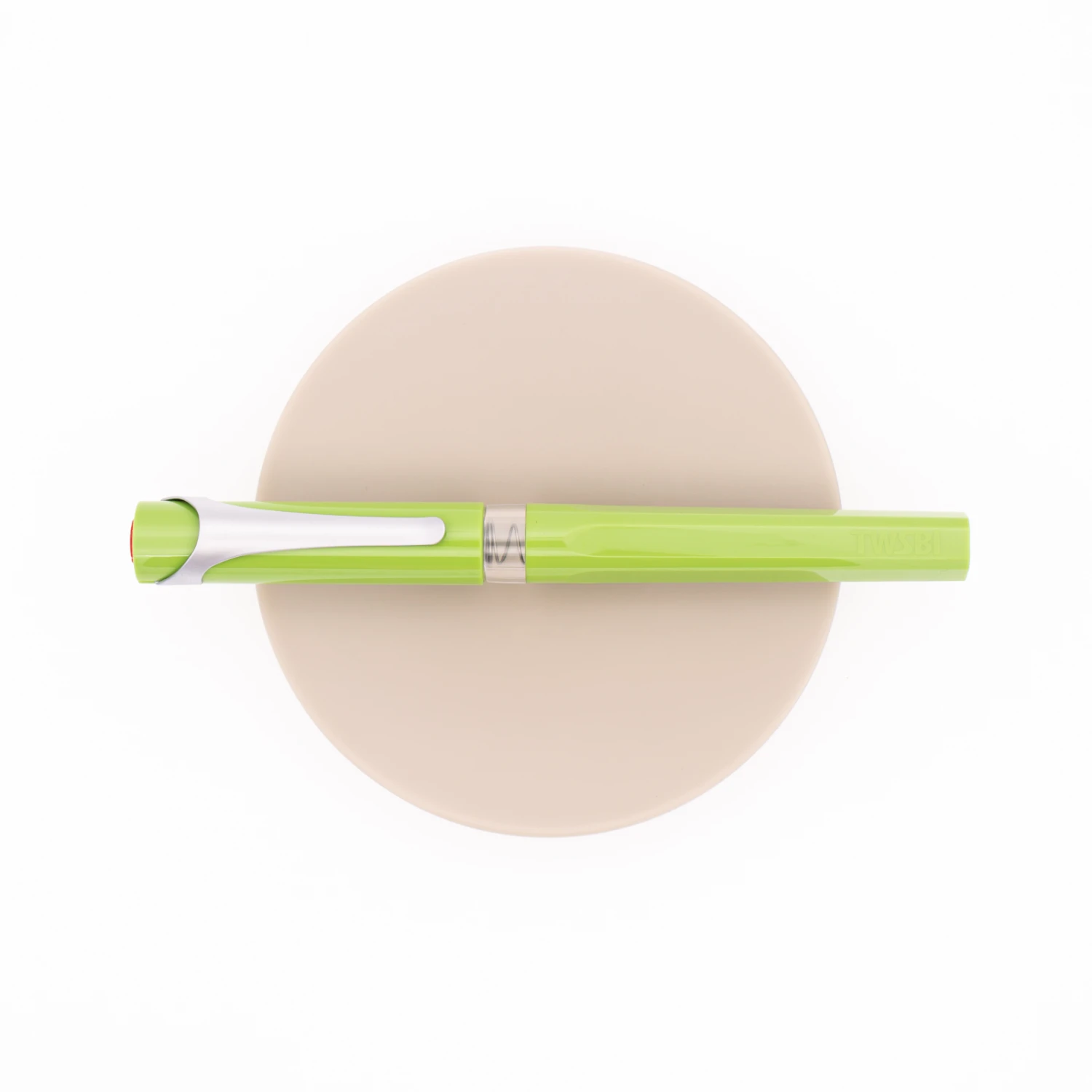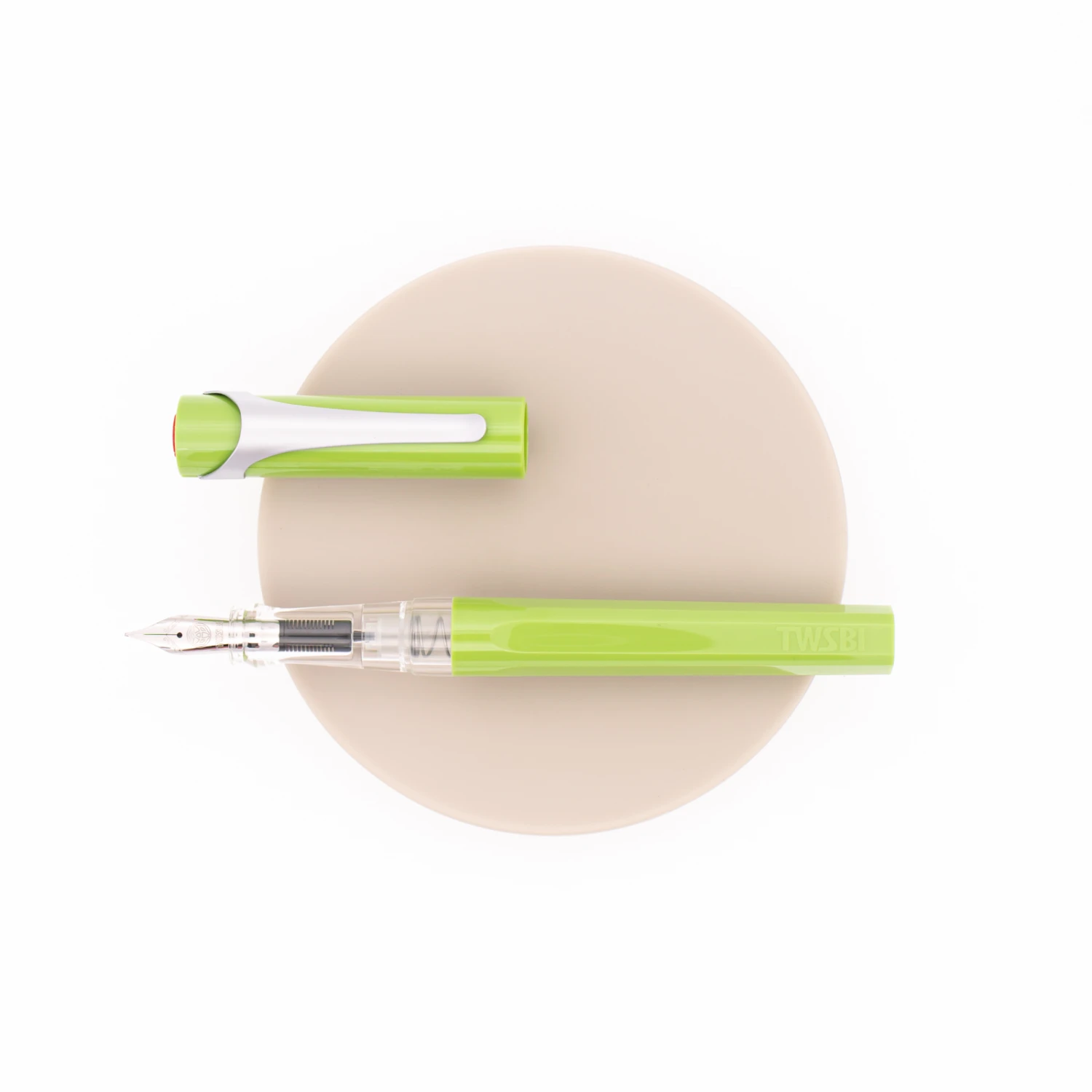 Twsbi Swipe Pear Green presenta un corpo in resina verde pera dalla forma pentagonale ed una sezione dell’impugnatura in trasparente che si vede anche con il cappuccio chiuso così da mostrare la quantità di inchiostro residua. Il cappuccio ha una clip satinata ed una forma tonda con il logo Twsbi rosso sulla sua parte superiore.