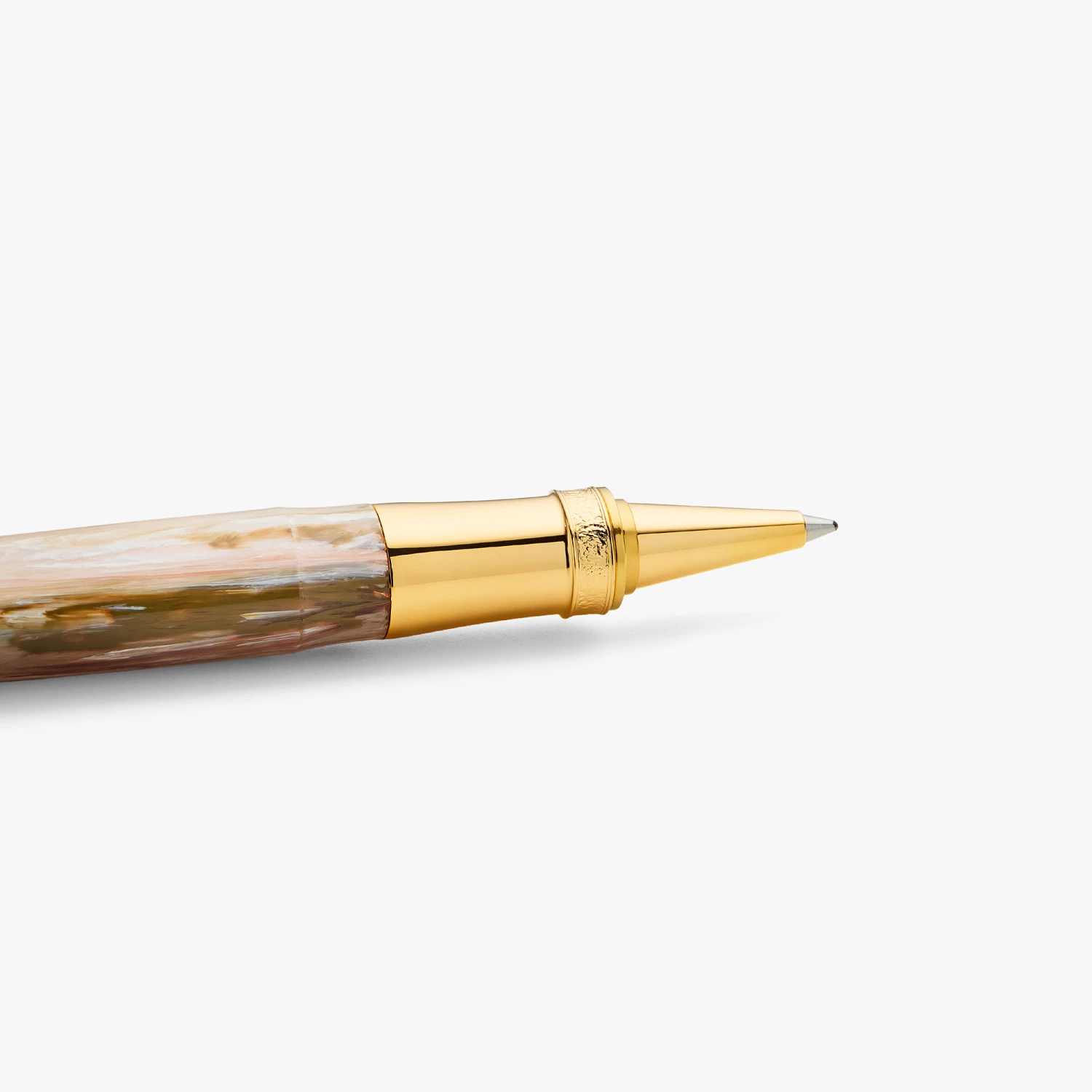 La penna roller Visconti Comedia Virgilio presenta un raffinato corpo in resina acrilica in tonalità avorio, con sfumature di verde alloro e tocchi di rosso fuoco, simbolo di saggezza e passione per la conoscenza. Adornata con luminose finiture oro giallo, questa penna è un tributo allo spirito nobile del poeta. La veretta è incisa e smaltata con il nome di Virgilio, a testimonianza della sua eredità senza tempo. Anche la sommità del cappuccio, caso unico per una collezione Visconti, presenta una raffinata smaltatura.