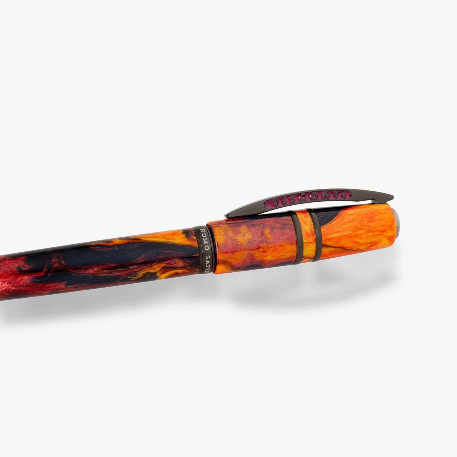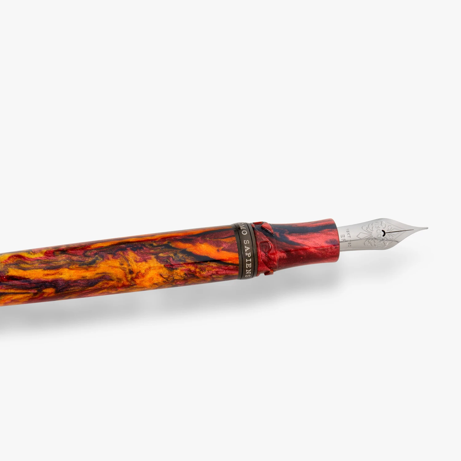 Visconti Homo Sapiens Earth Origins Fire è realizzata in resina J. Brooks dalle tonalità accese di rosso, arancio e nero, ispirate alle suggestive scintille del fuoco in una notte buia, e completate da eleganti finiture in PVD nero. La penna stilografica è equipaggiata di un pennino in oro 18k e disponibile in tiratura limitata a soli 388 esemplari.