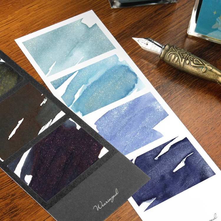 La carta Impression di Wearingeul ha grammatura 200 gsm e mostra le varie caratteristiche degli inchiostri come shading, sheen, colori e così via.